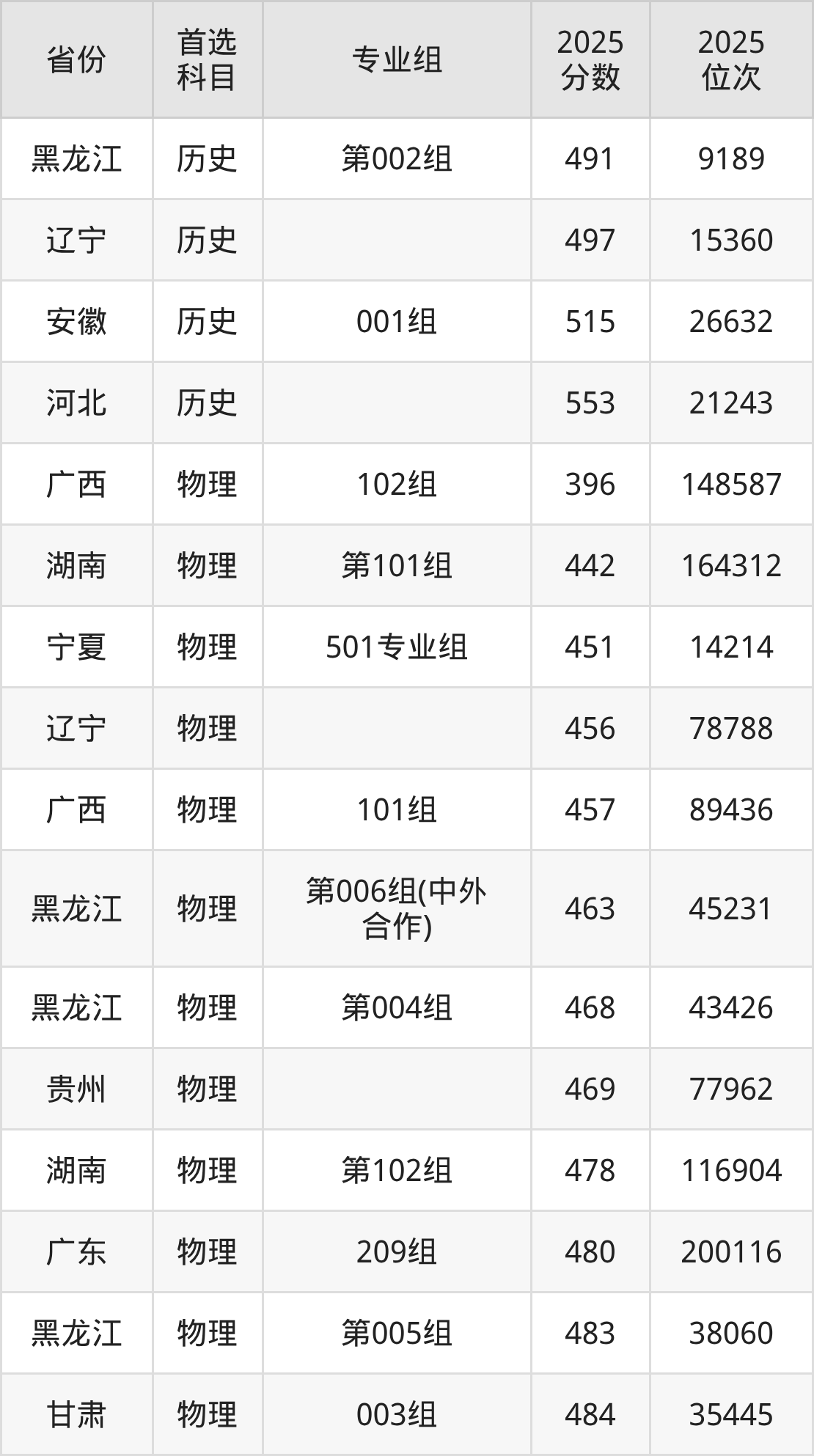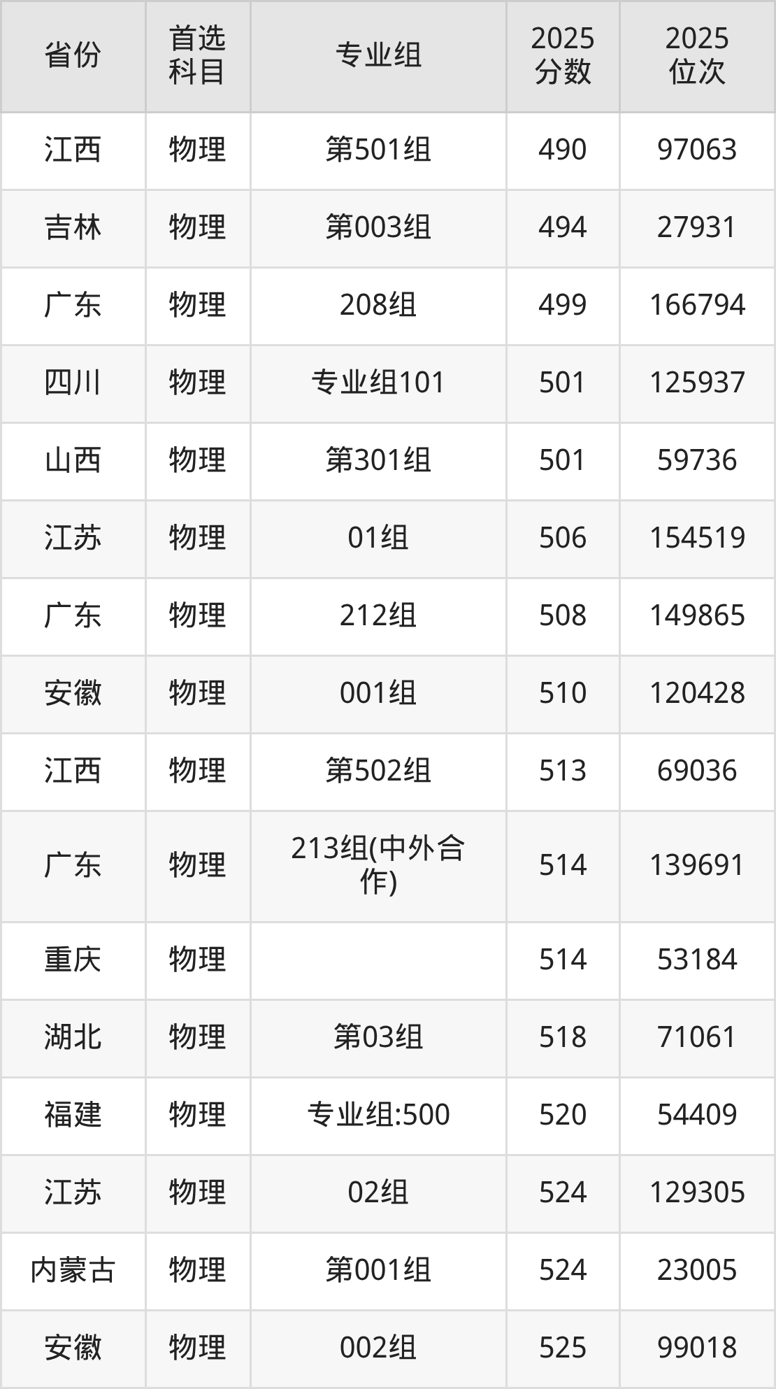 物理类最低分对应地区为广西(102组),录取位次为148587,超本科线26分;最高分对应地区为广东(211组),录取位次为93971,超本科线105分。