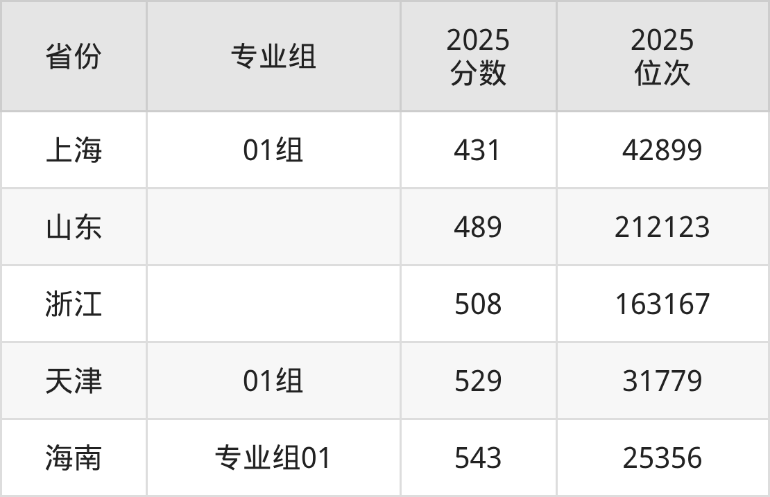 最低分对应地区为上海(01组),录取位次为42899,超本科线29分;最高分对应地区为海南(专业组01),录取位次为25356,超本科线63分。