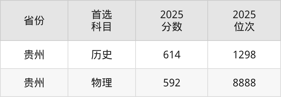 历史类最低分对应地区为贵州,录取位次为1298,超本科线156分。