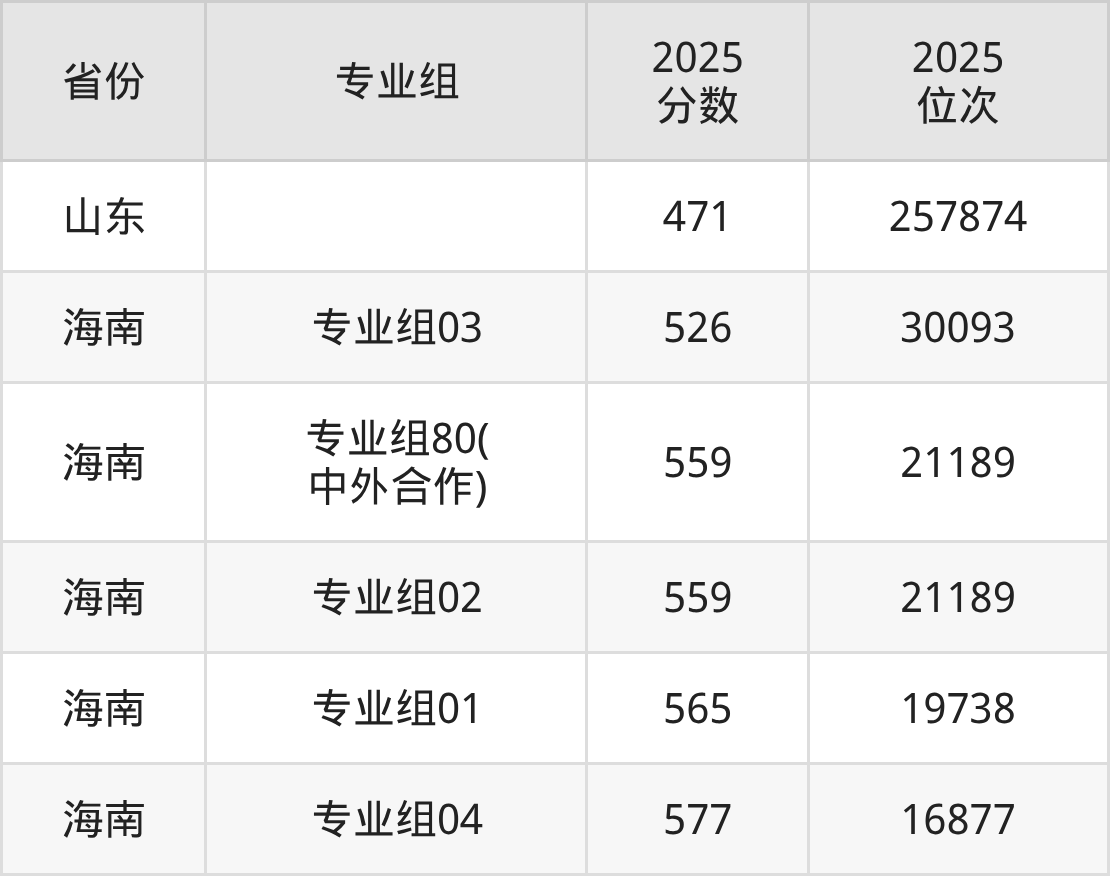 最低分对应地区为山东,录取位次为257874,超一段线59分;最高分对应地区为海南(专业组04),录取位次为16877,超本科线97分。