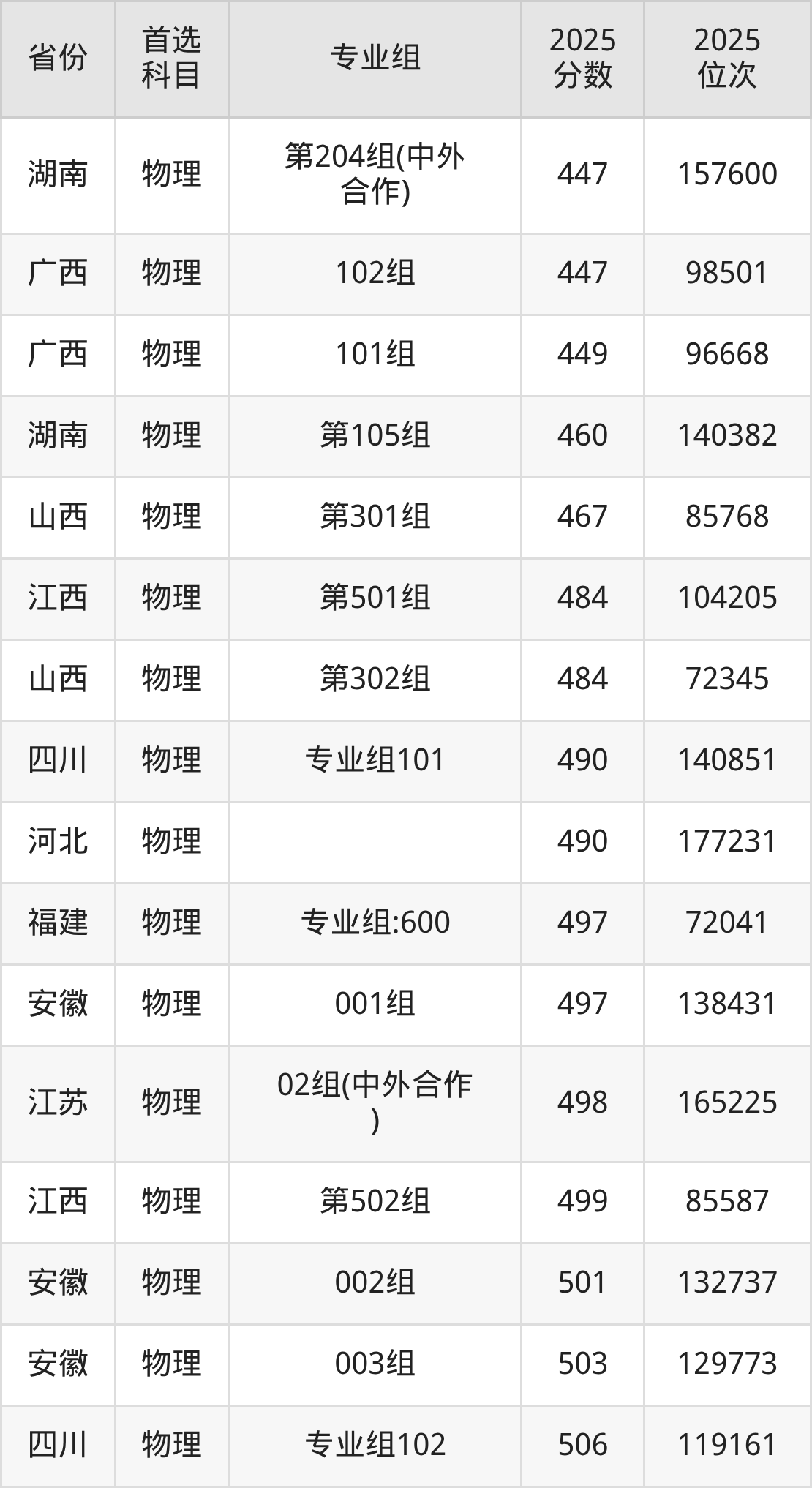 物理类最低分对应地区为甘肃(002组),录取位次为59737,超本科线63分;最高分对应地区为江苏(03组),录取位次为70814,超本科线104分。