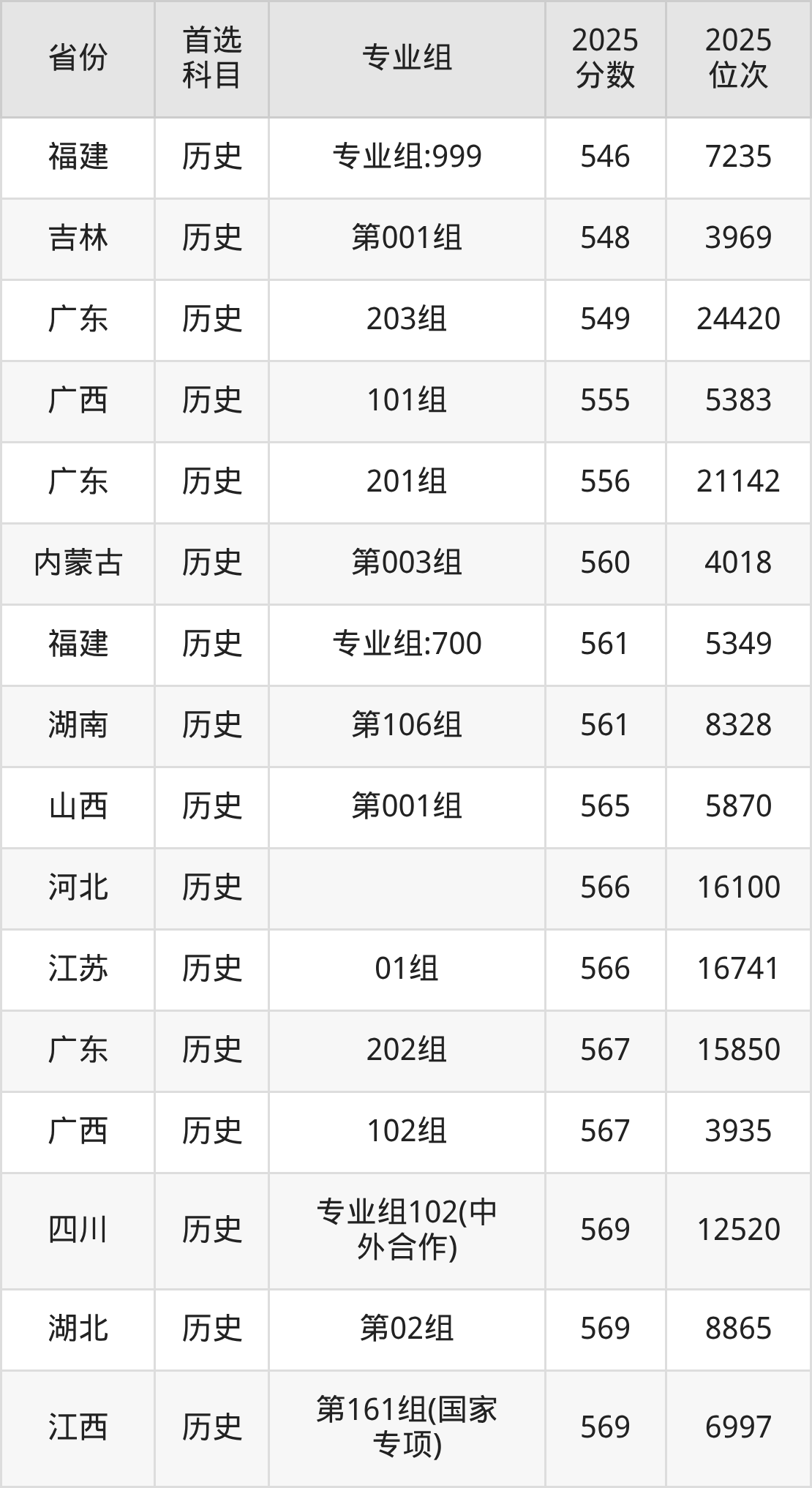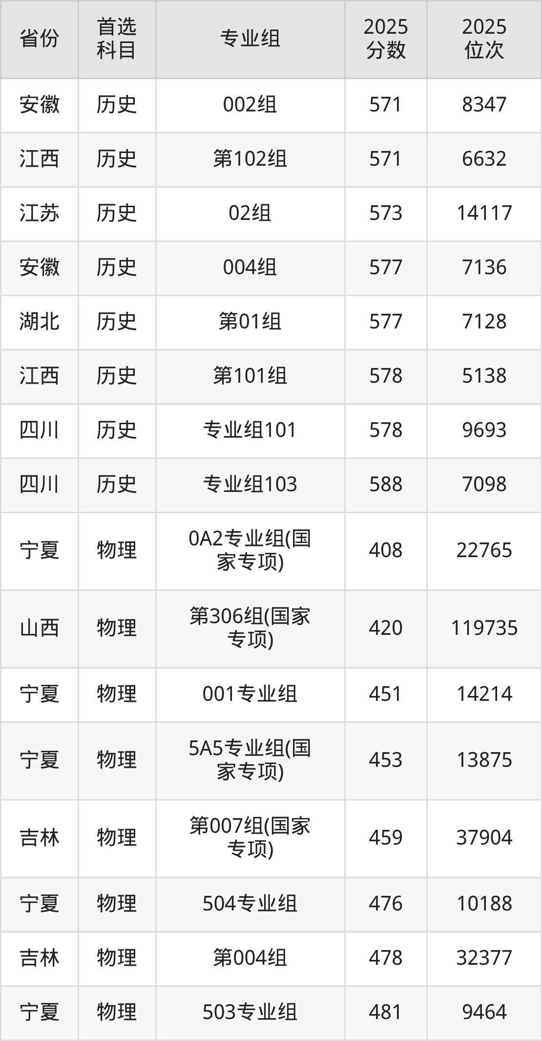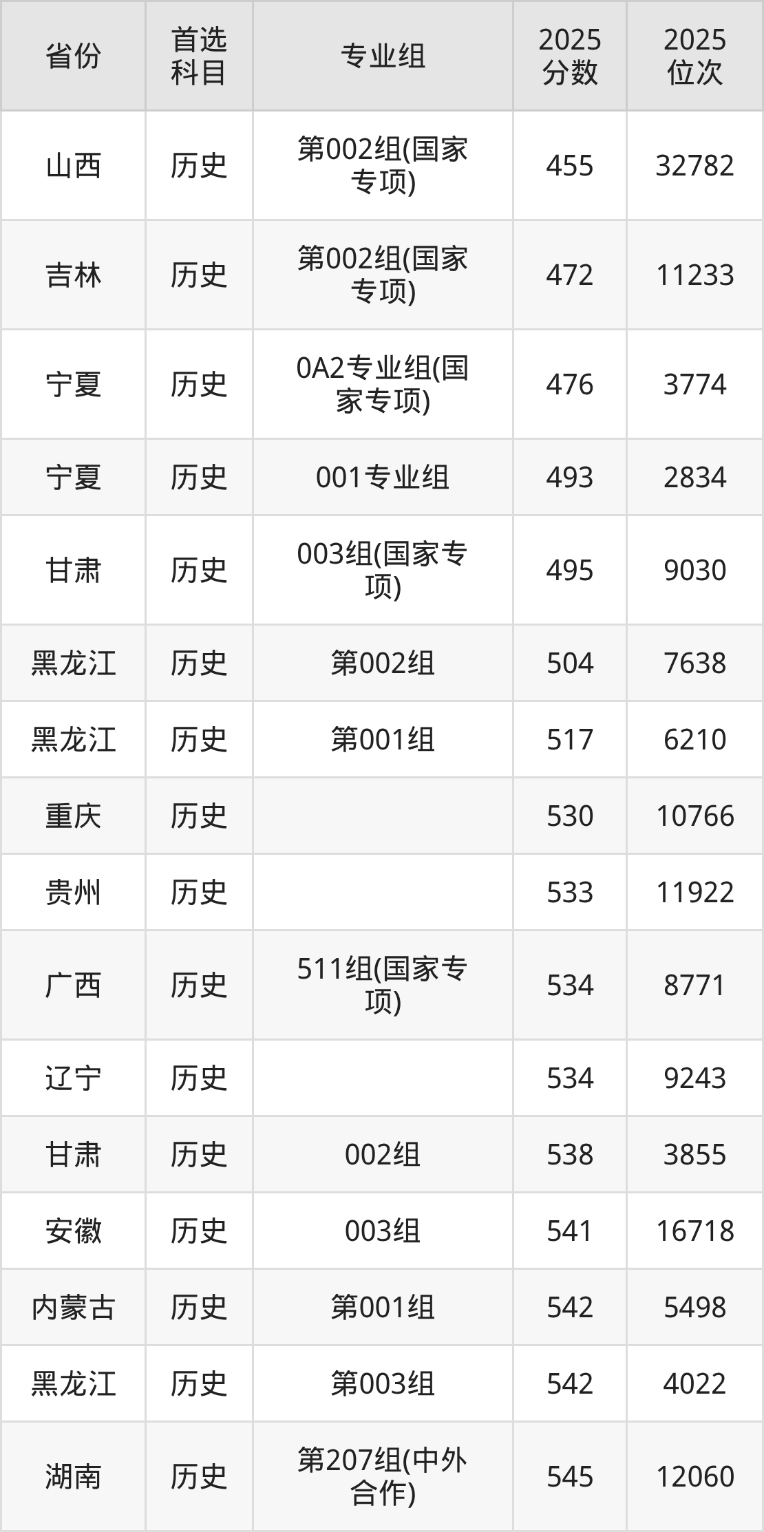 历史类最低分对应地区为山西(第002组(国家专项)),录取位次为32782,超本科线12分;最高分对应地区为四川(专业组103),录取位次为7098,超本科B121分。