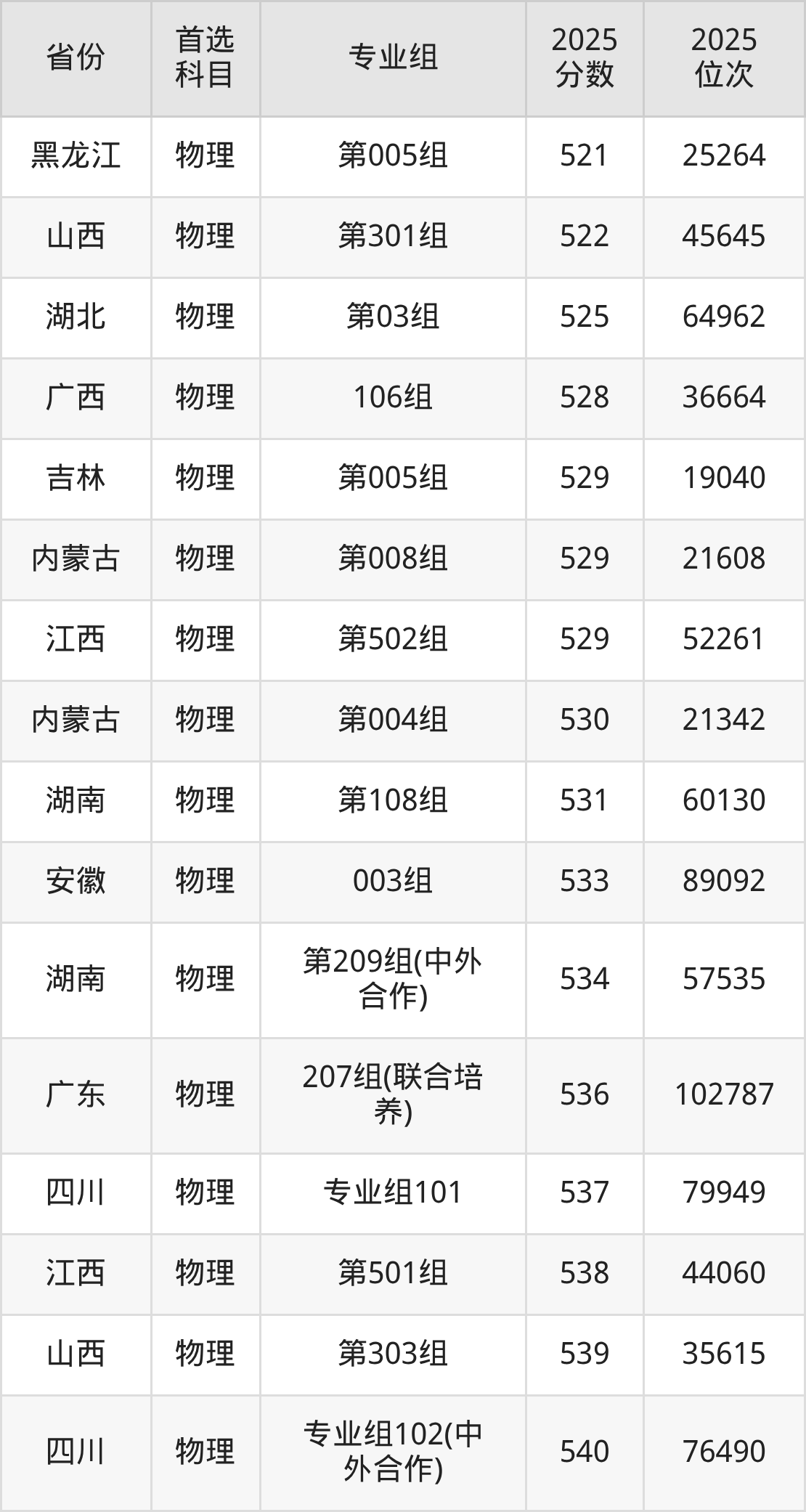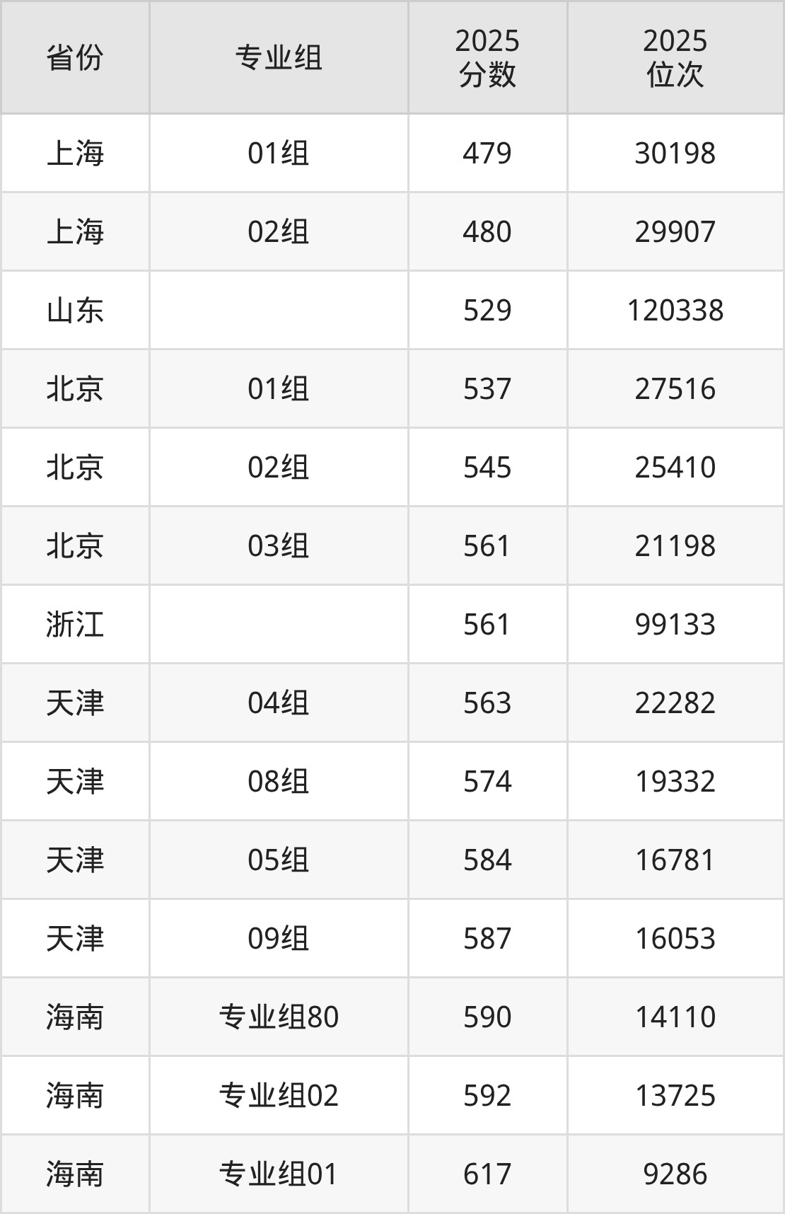 最低分对应地区为上海(01组),录取位次为30198,超本科线77分;最高分对应地区为海南(专业组01),录取位次为9286,超本科线137分。
