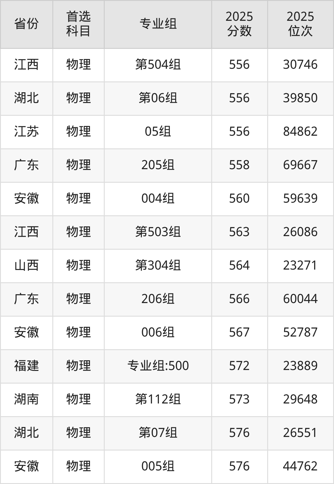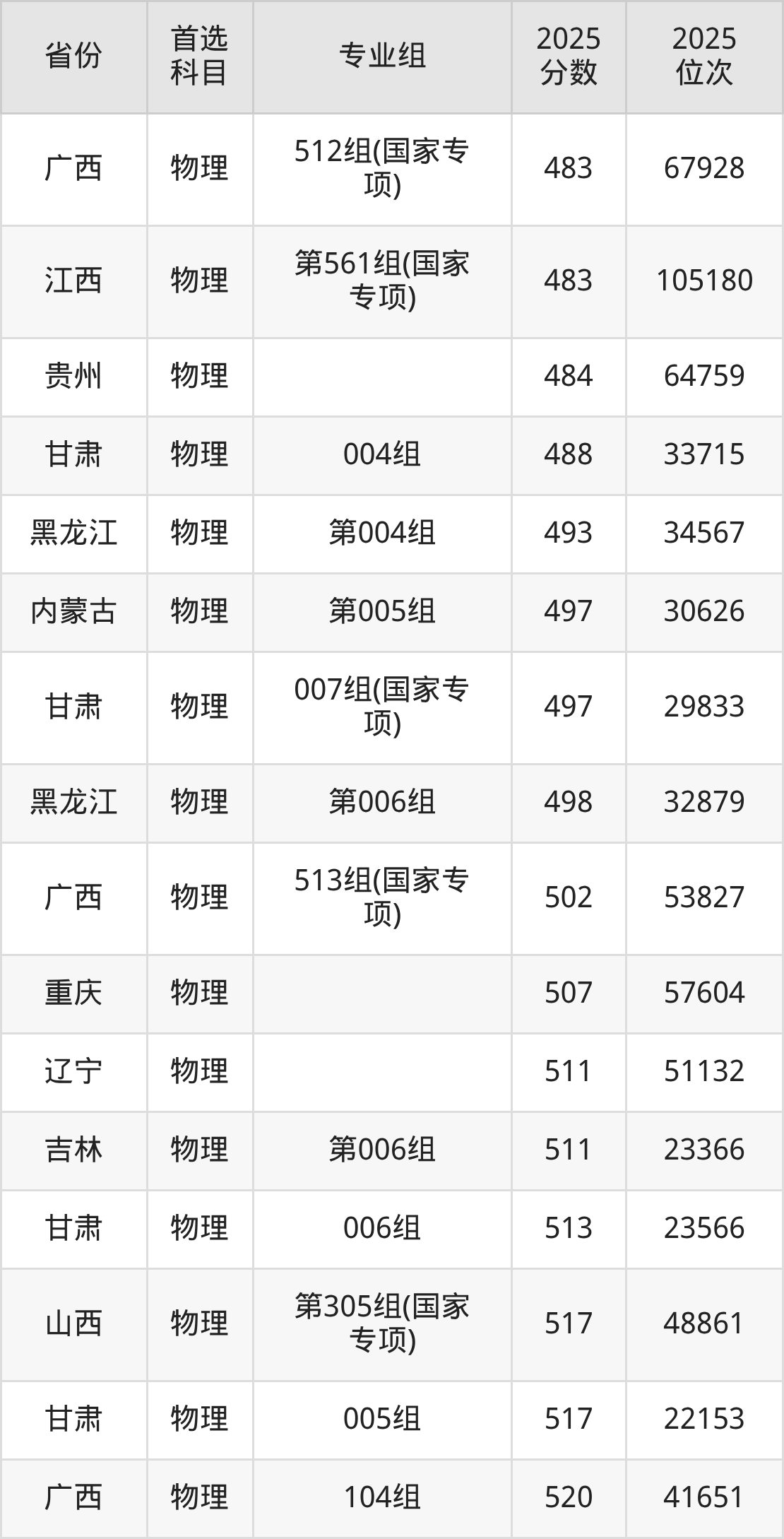 物理类最低分对应地区为宁夏(0A2专业组(国家专项)),录取位次为22765,超本科B36分;最高分对应地区为安徽(005组),录取位次为44762,超本科线115分。