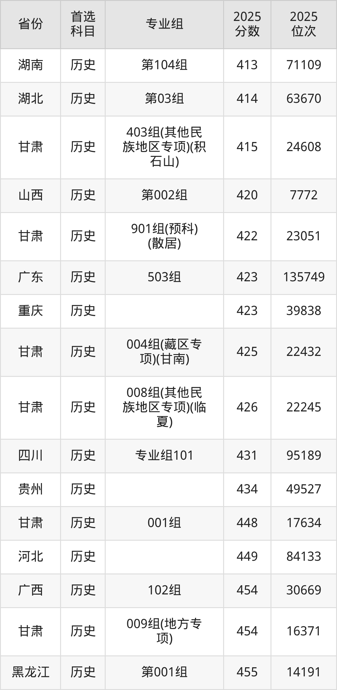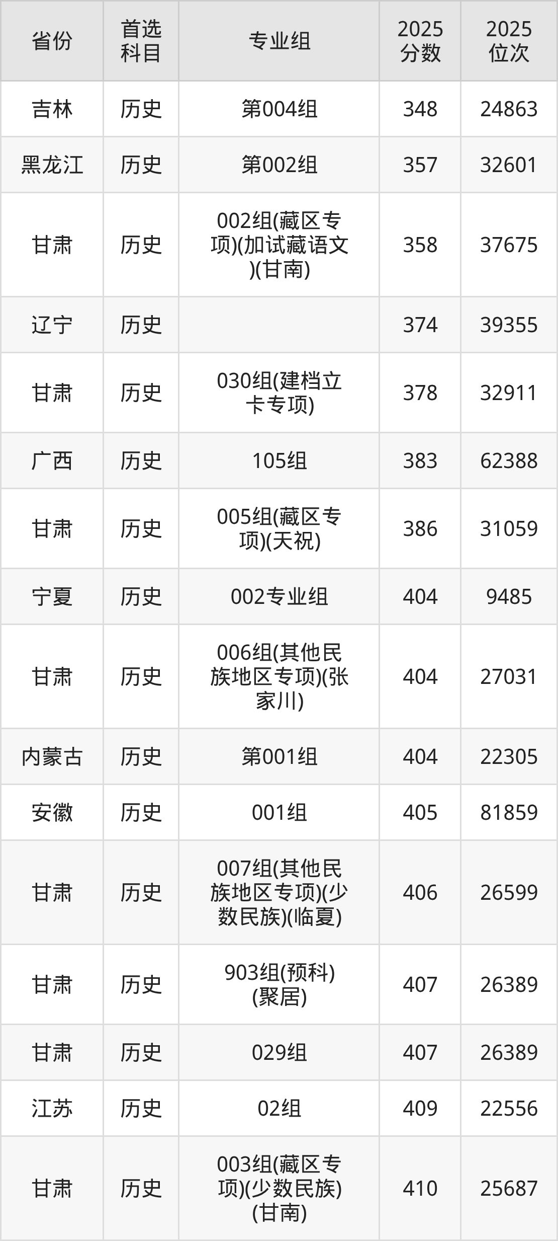 历史类:001组448分、17634名,002组(藏区专项)(加试藏语文)(甘南)358分、37675名,003组(藏区专项)(少数民族)(甘南)410分、25687名,004组(藏区专项)(甘南)425分、22432名,005组(藏区专项)(天祝)386分、31059名,006组(其他民族地区专项)(张家川)404分、27031名,007组(其他民族地区专项)(少数民族)(临夏)406分、26599名,008组(其他民族地区专项)(临夏)426分、22245名,009组(地方专项)454分、16371名,029组407分、26389名,030组(建档立卡专项)378分、32911名,403组(其他民族地区专项)(积石山)415分、24608名,901组(预科)(散居)422分、23051名,903组(预科)(聚居)407分、26389名;