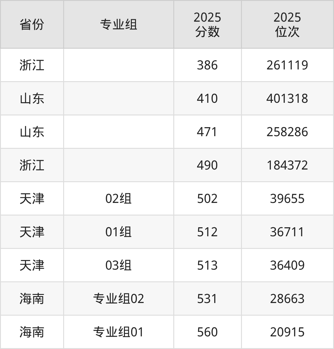 最低分对应地区为浙江,录取位次为261119,超二段线118分;最高分对应地区为海南(专业组01),录取位次为20915。