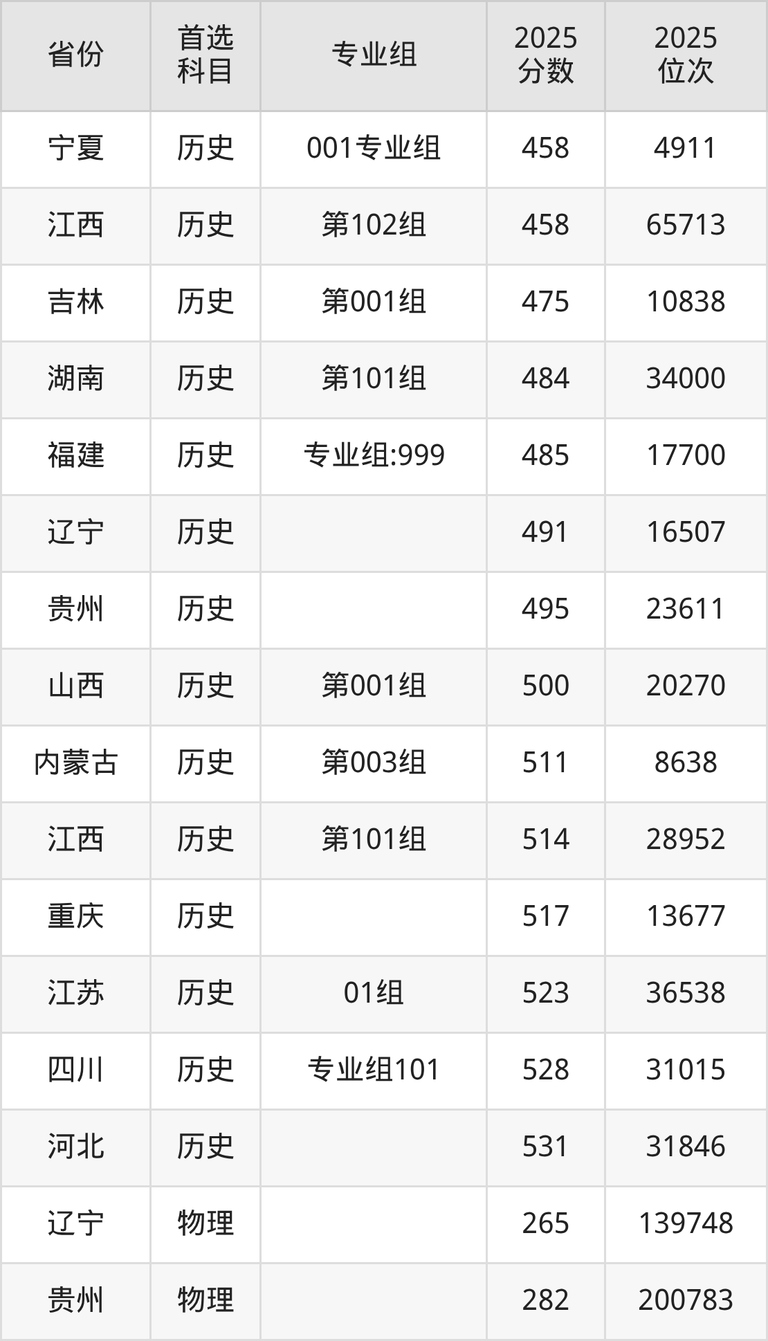 历史类最低分对应地区为吉林(第004组),录取位次为24863,超专科线188分;最高分对应地区为河北,录取位次为31846,超本科线54分。
