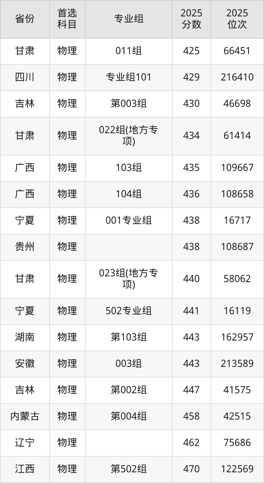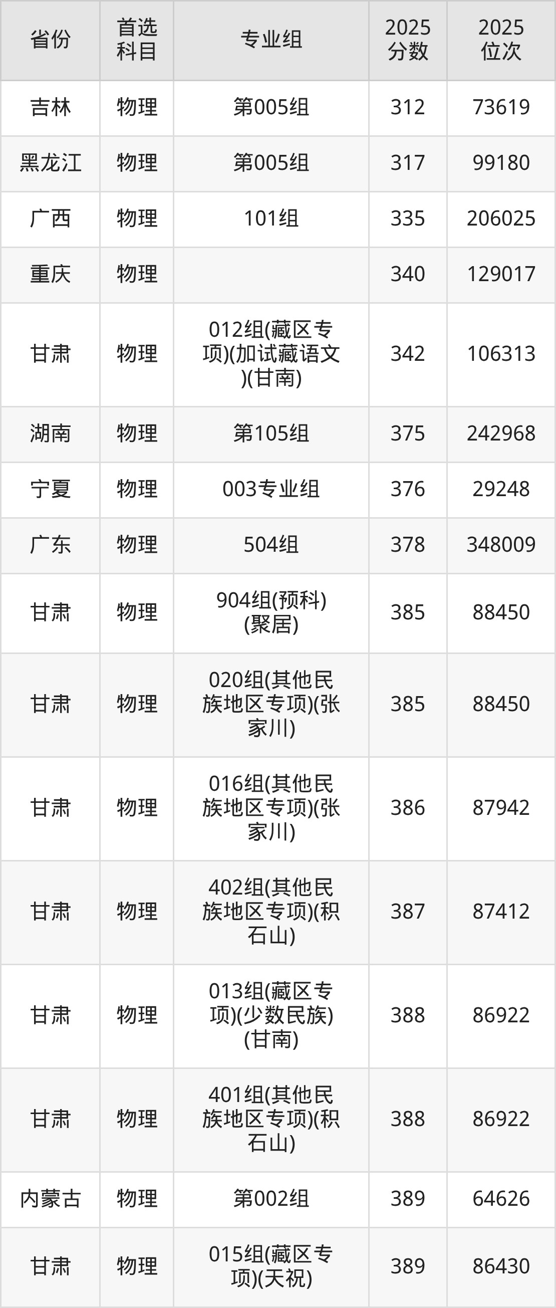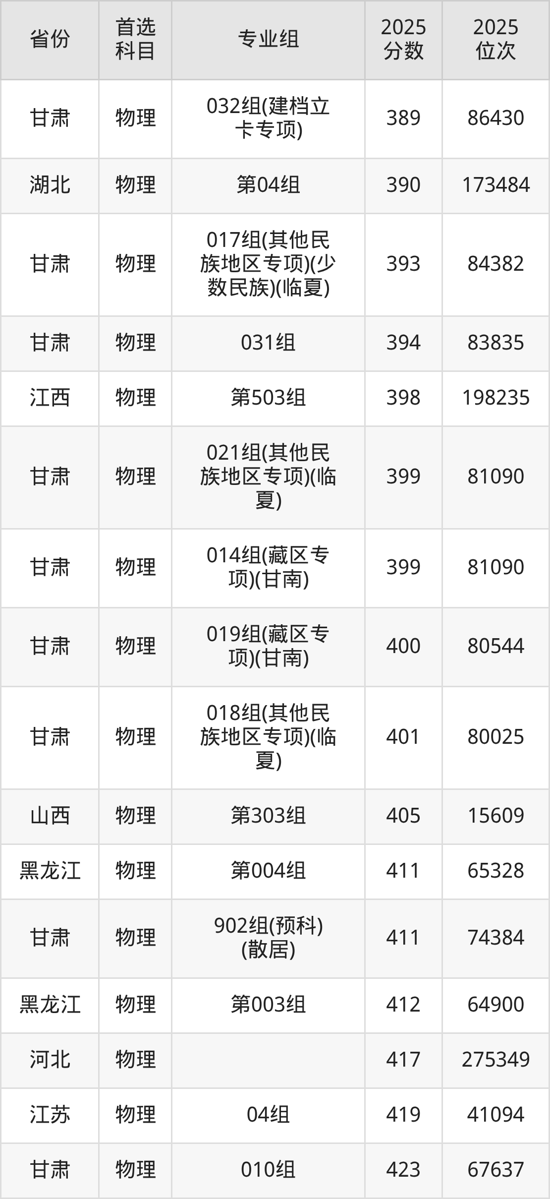 物理类:010组423分、67637名,011组425分、66451名,012组(藏区专项)(加试藏语文)(甘南)342分、106313名,013组(藏区专项)(少数民族)(甘南)388分、86922名,014组(藏区专项)(甘南)399分、81090名,015组(藏区专项)(天祝)389分、86430名,016组(其他民族地区专项)(张家川)386分、87942名,017组(其他民族地区专项)(少数民族)(临夏)393分、84382名,018组(其他民族地区专项)(临夏)401分、80025名,019组(藏区专项)(甘南)400分、80544名,020组(其他民族地区专项)(张家川)385分、88450名,021组(其他民族地区专项)(临夏)399分、81090名,022组(地方专项)434分、61414名,023组(地方专项)440分、58062名,031组394分、83835名,032组(建档立卡专项)389分、86430名,401组(其他民族地区专项)(积石山)388分、86922名,402组(其他民族地区专项)(积石山)387分、87412名,902组(预科)(散居)411分、74384名,904组(预科)(聚居)385分、88450名;