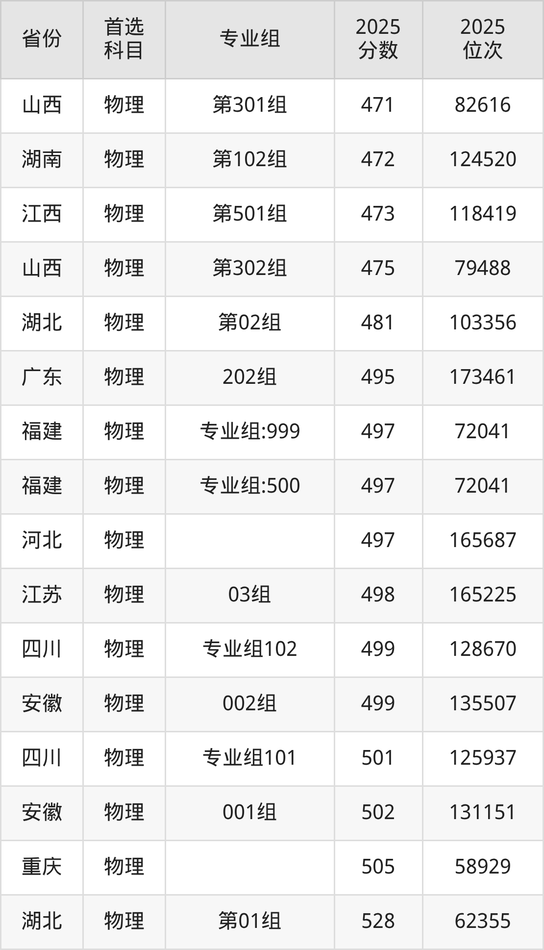 物理类最低分对应地区为辽宁,录取位次为139748,超专科线115分;最高分对应地区为湖北(第01组),录取位次为62355,超本科线102分。