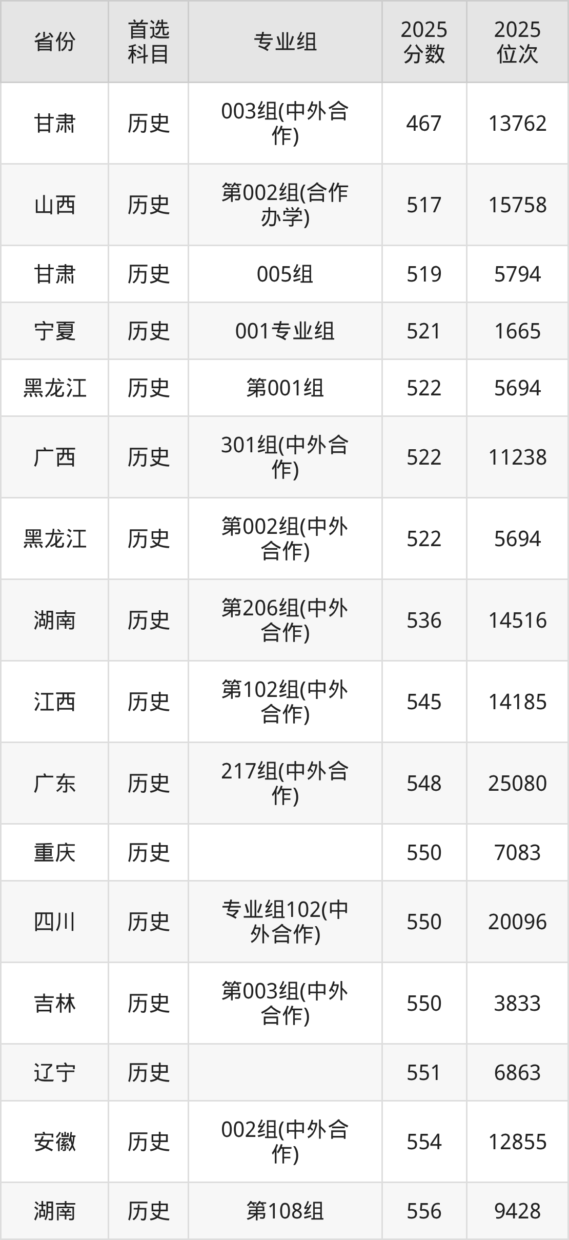 历史类最低分对应地区为甘肃(003组(中外合作)),录取位次为13762,超本科线55分;最高分对应地区为四川(专业组104),录取位次为5355,超本科B129分。