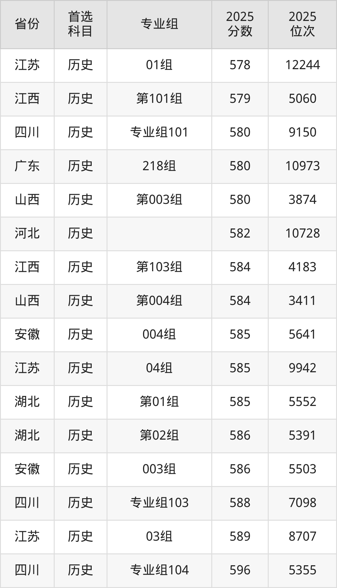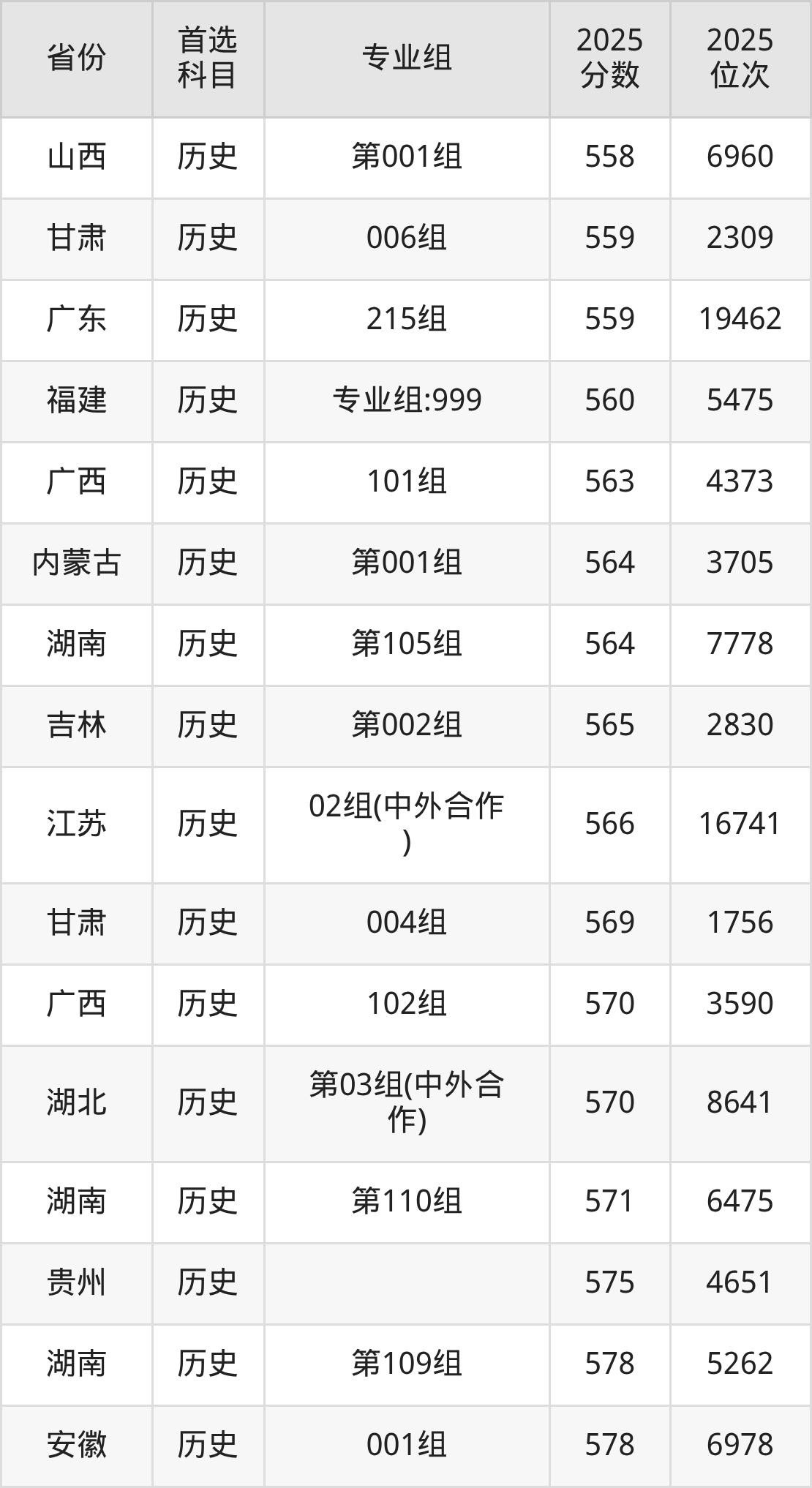 历史类:第108组555分、8250名,第109组561分、7140名,第110组570分、5583名,第111组562分、6962名,第206组(中外合作)556分、8069名,第Y07组(艺术专业)477分、35117名;