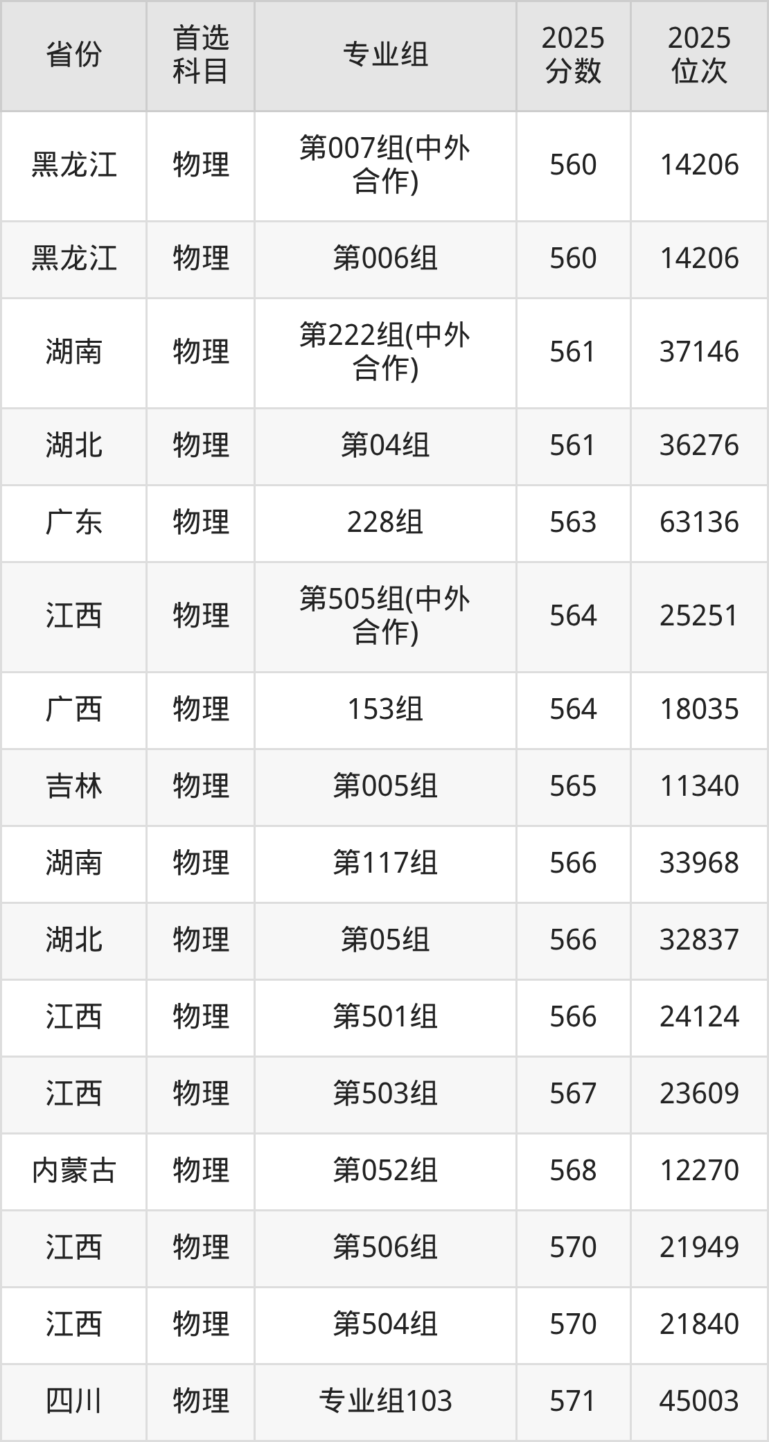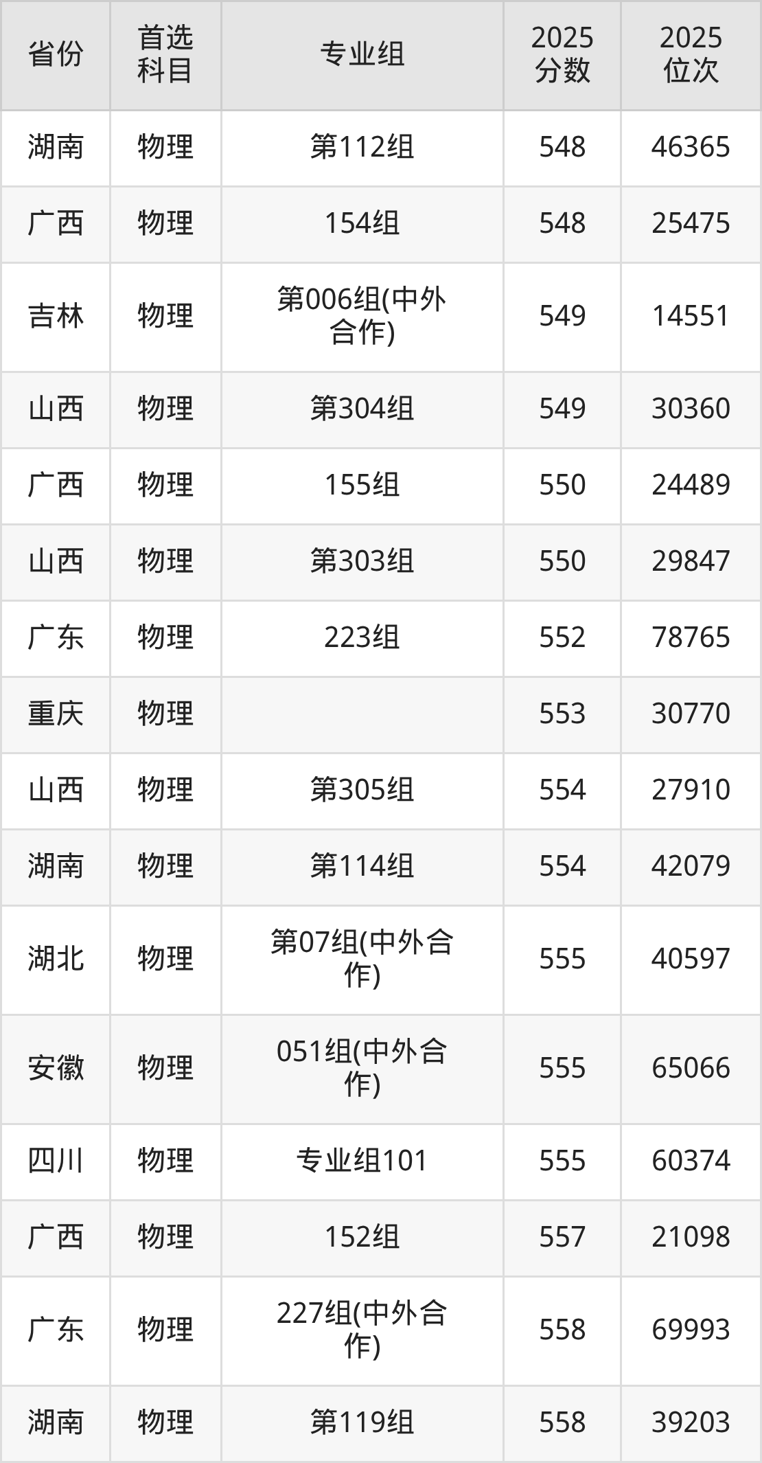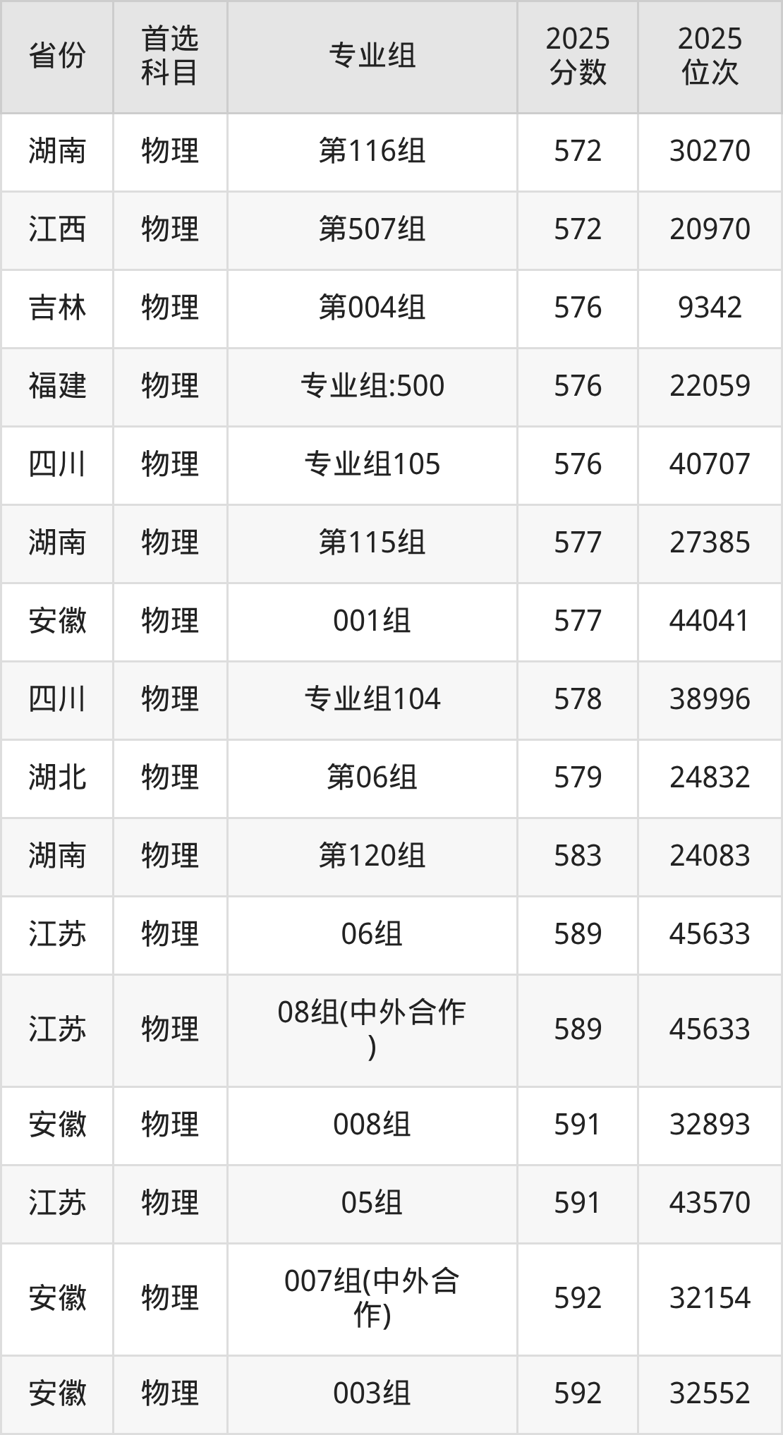 物理类:第112组548分、46365名,第114组554分、42079名,第115组577分、27385名,第116组572分、30270名,第117组566分、33968名,第119组558分、39203名,第120组583分、24083名,第213组(中外合作)529分、61880名,第218组(中外合作)522分、68225名,第222组(中外合作)561分、37146名;