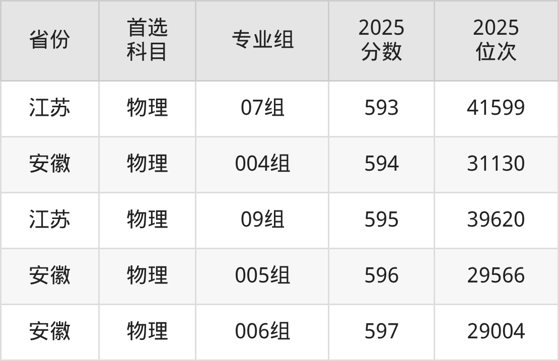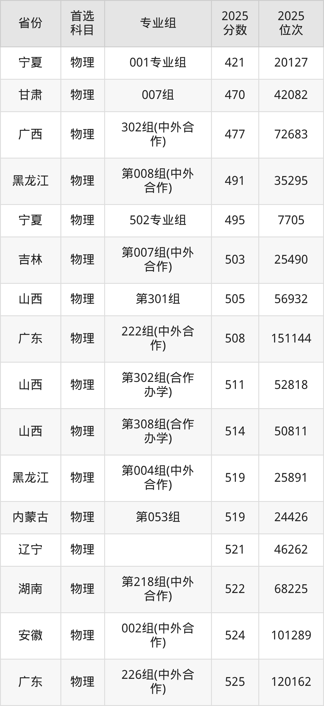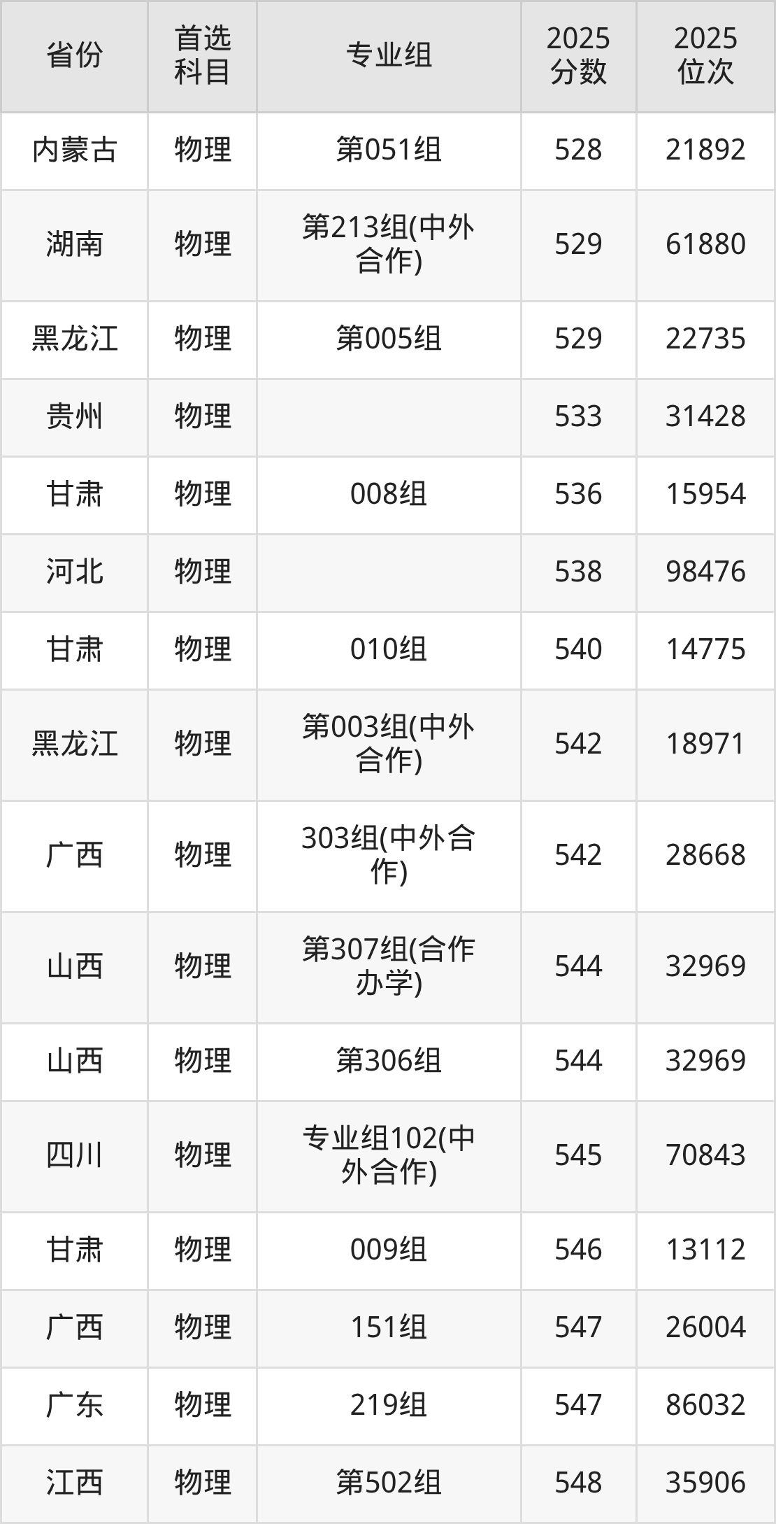 物理类:第112组548分、46365名,第114组554分、42079名,第115组577分、27385名,第116组572分、30270名,第117组566分、33968名,第119组558分、39203名,第120组583分、24083名,第213组(中外合作)529分、61880名,第218组(中外合作)522分、68225名,第222组(中外合作)561分、37146名;