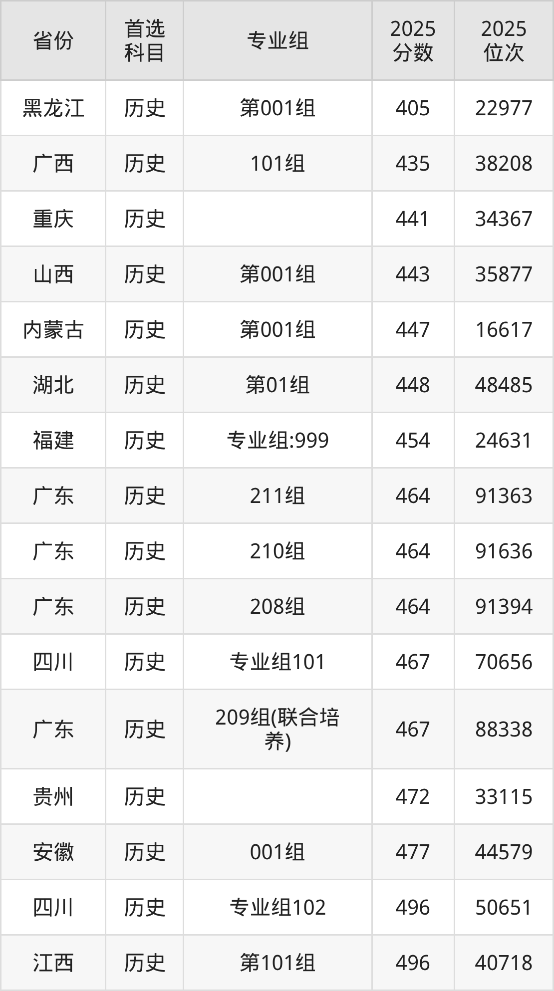 历史类:208组464分、91394名,209组(联合培养)467分、88338名,210组464分、91636名,211组464分、91363名;