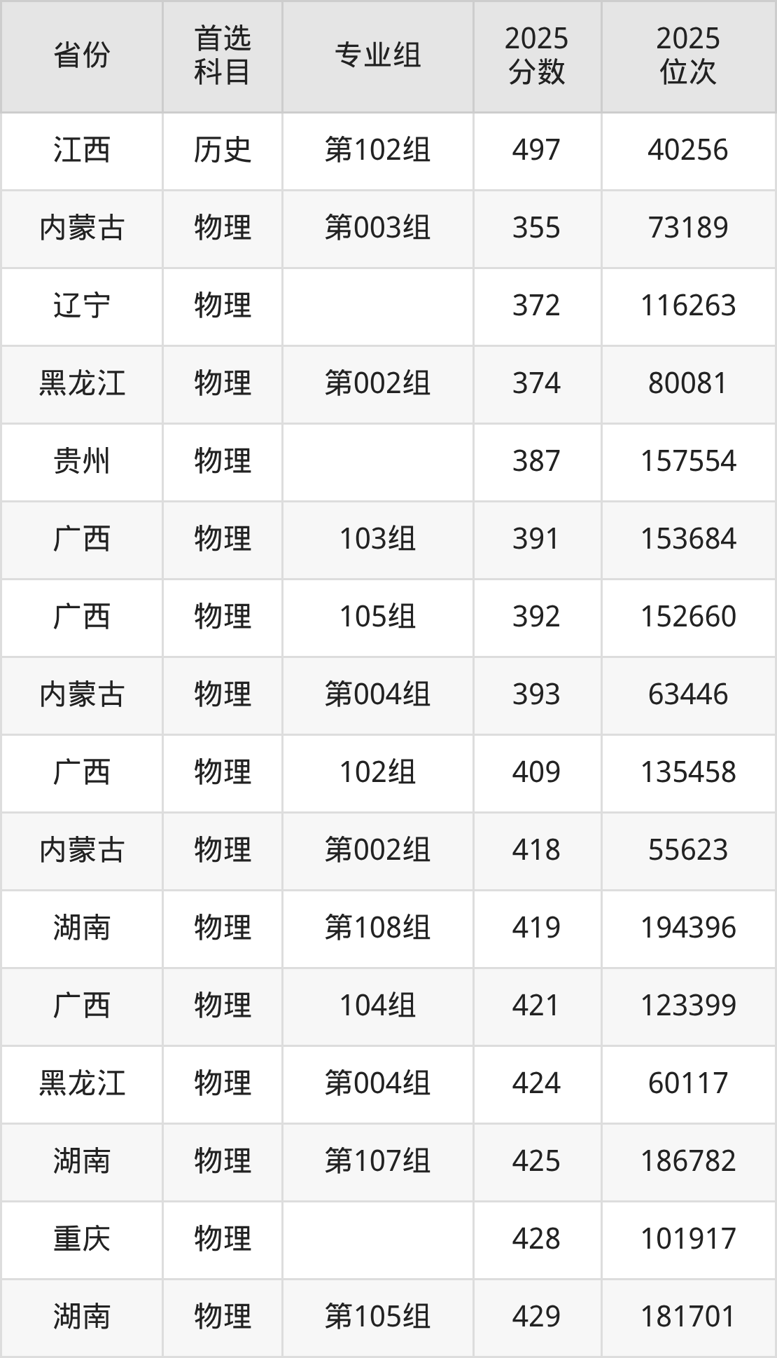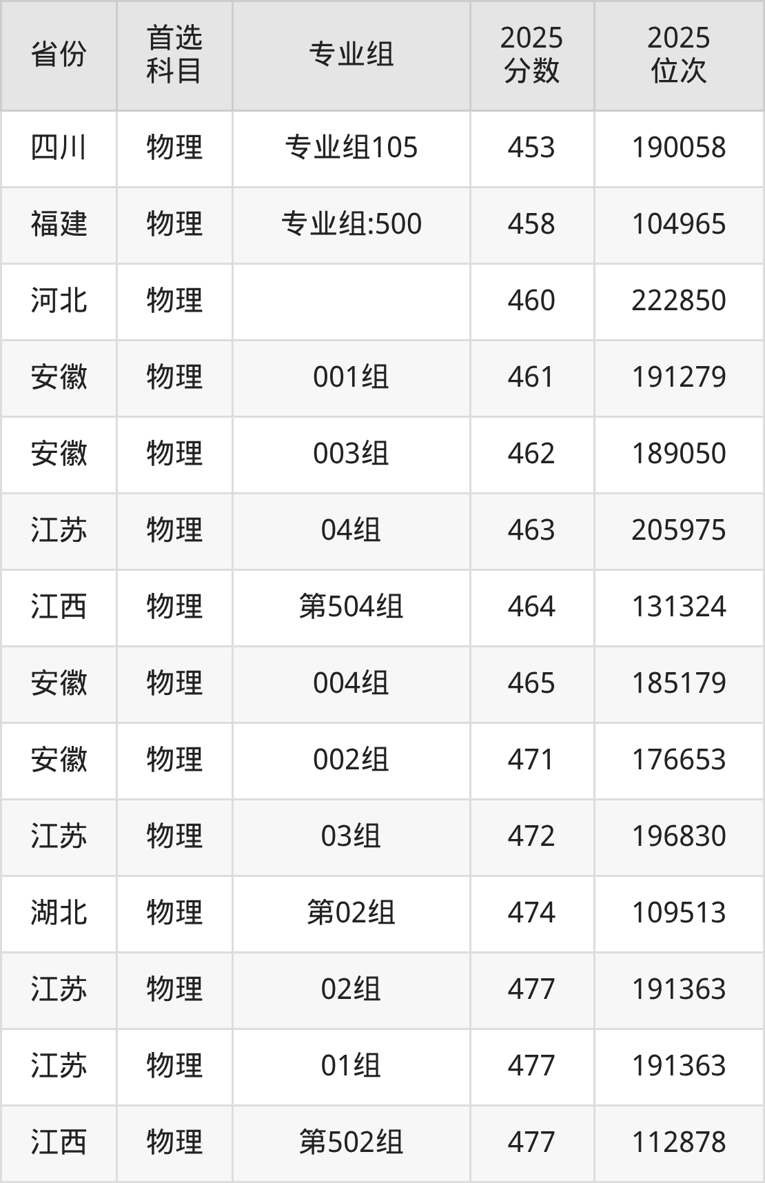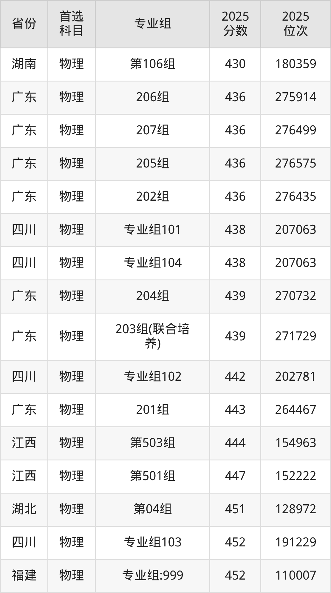 物理类:201组443分、264467名,202组436分、276435名,203组(联合培养)439分、271729名,204组439分、270732名,205组436分、276575名,206组436分、275914名,207组436分、276499名;