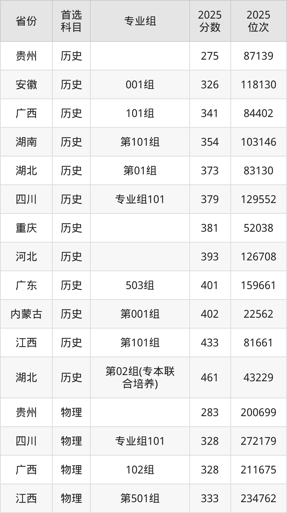 历史类最低分对应地区为贵州,录取位次为87139,超专科线95分;最高分对应地区为湖北(第02组(专本联合培养)),录取位次为43229,超专科线261分。