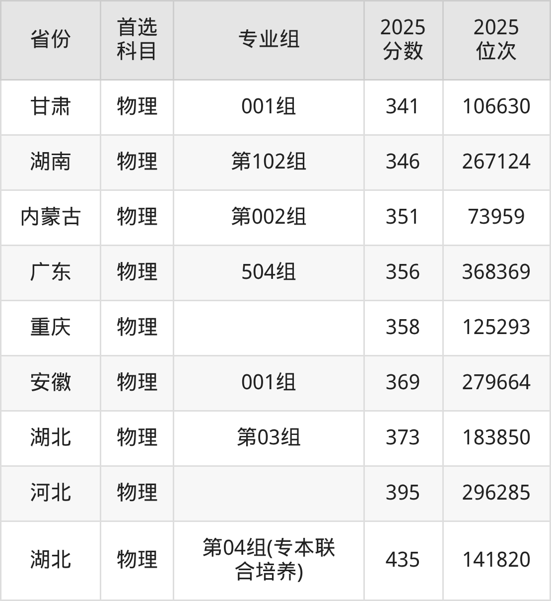 物理类:第03组373分、183850名,第04组(专本联合培养)435分、141820名;