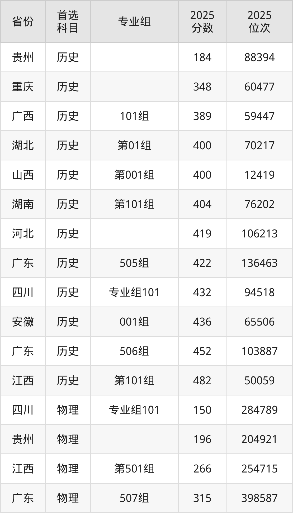 历史类最低分对应地区为贵州,录取位次为88394,超专科线4分;最高分对应地区为江西(第101组),录取位次为50059,超专科线192分。
