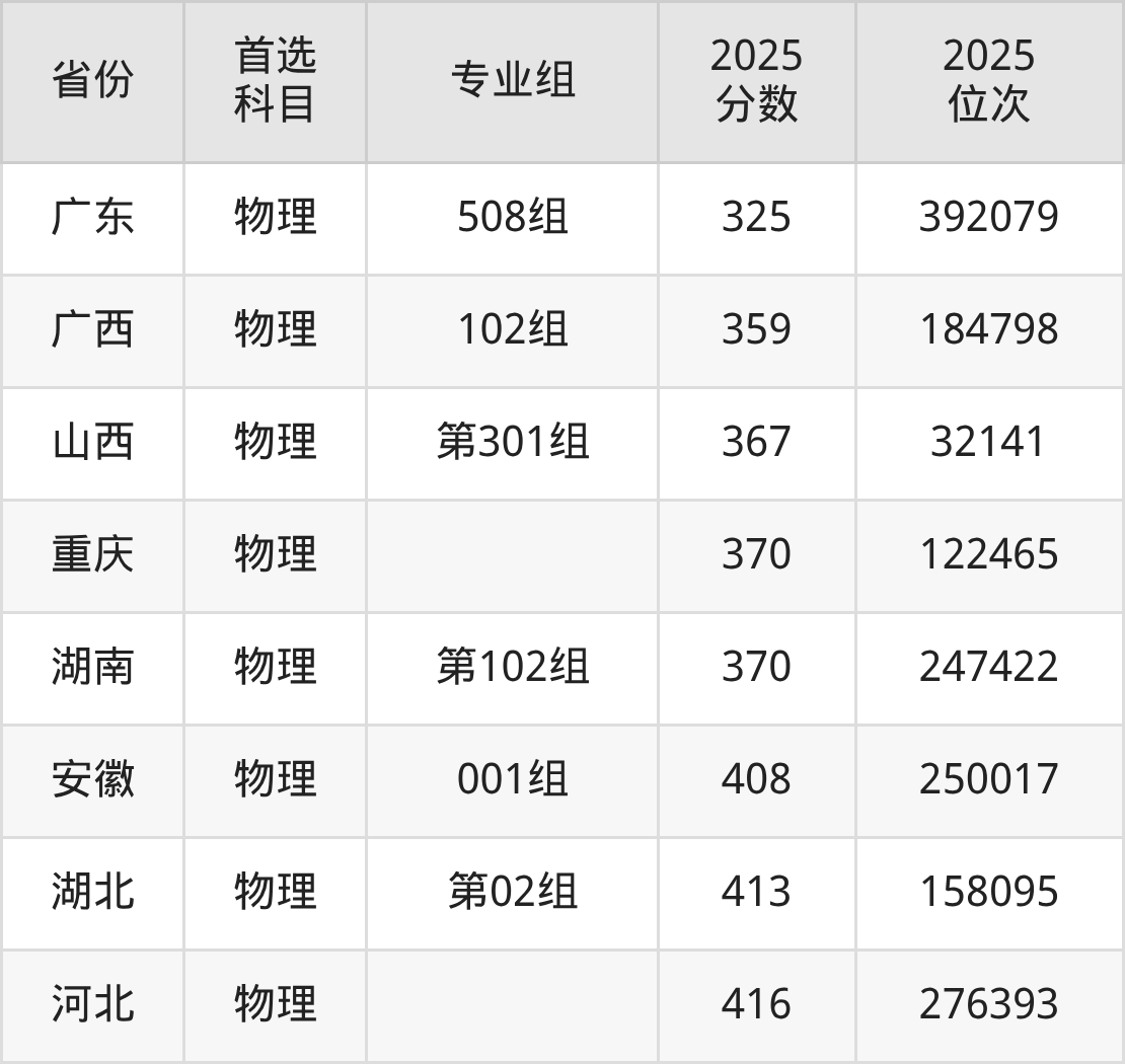 物理类最低分对应地区为四川(专业组101),录取位次为284789;最高分对应地区为河北,录取位次为276393,超专科线216分。