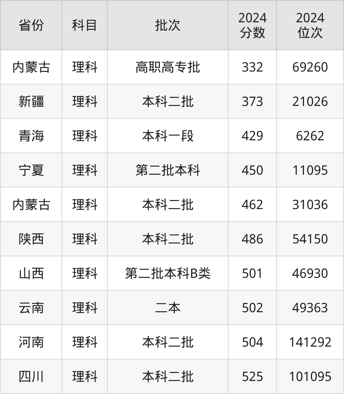 理科最低分对应地区为内蒙古,录取位次为69260,超172分;最高分对应地区为四川,录取位次为101095,超二本线66分。
