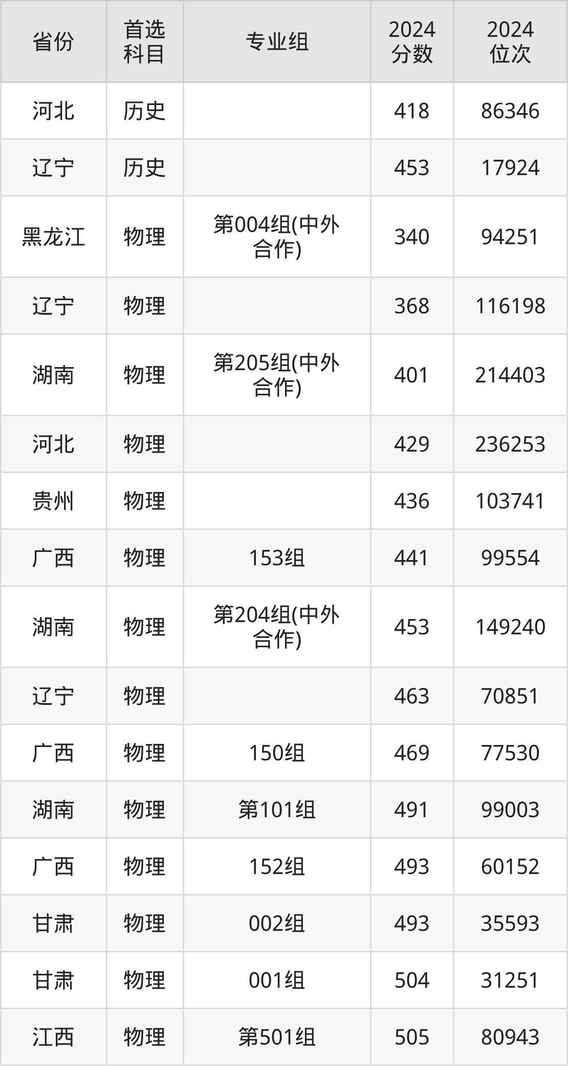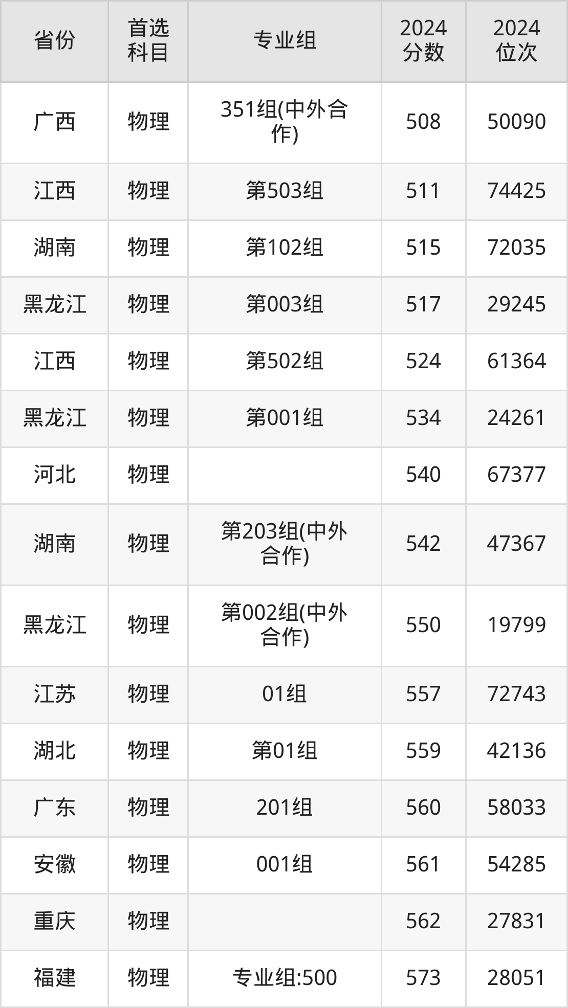 物理类最低分对应地区为黑龙江(第004组(中外合作)),录取位次为94251,超专科线180分;最高分对应地区为福建(专业组:500),录取位次为28051,超本科线124分。