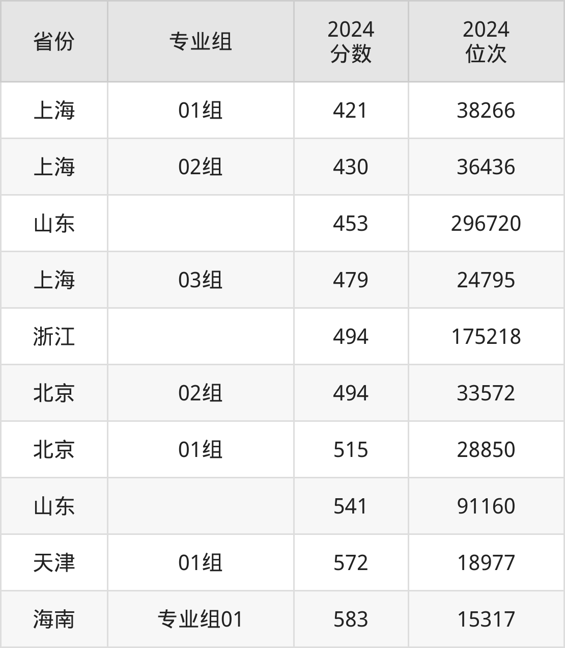 最低分对应地区为上海(01组),录取位次为38266,超本科线18分;最高分对应地区为海南(专业组01),录取位次为15317,超本科线100分。