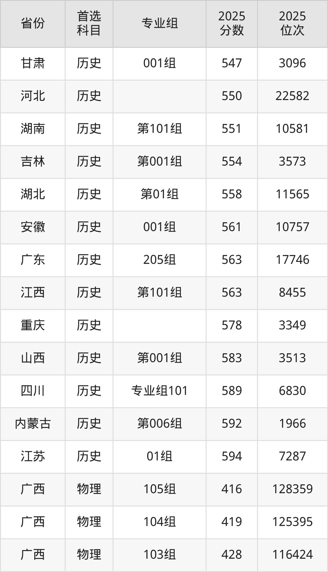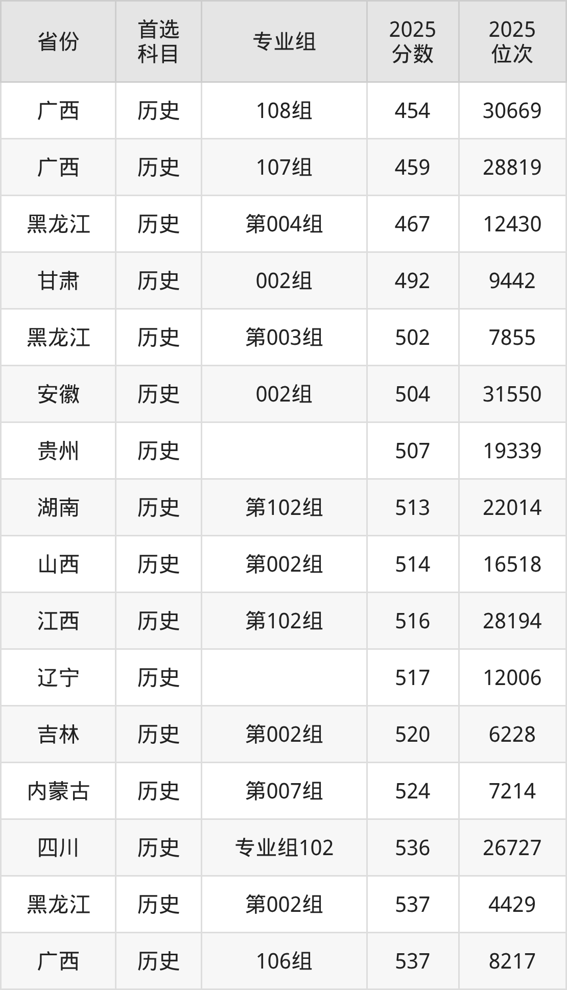 历史类最低分对应地区为广西(108组),录取位次为30669,超本科线52分;最高分对应地区为江苏(01组),录取位次为7287,超本科线112分。