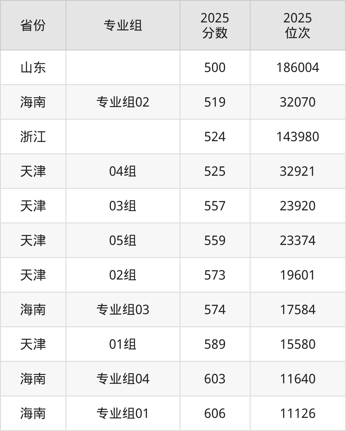 最低分对应地区为山东,录取位次为186004,超一段线101分;最高分对应地区为海南(专业组01),录取位次为11126,超本科线126分。