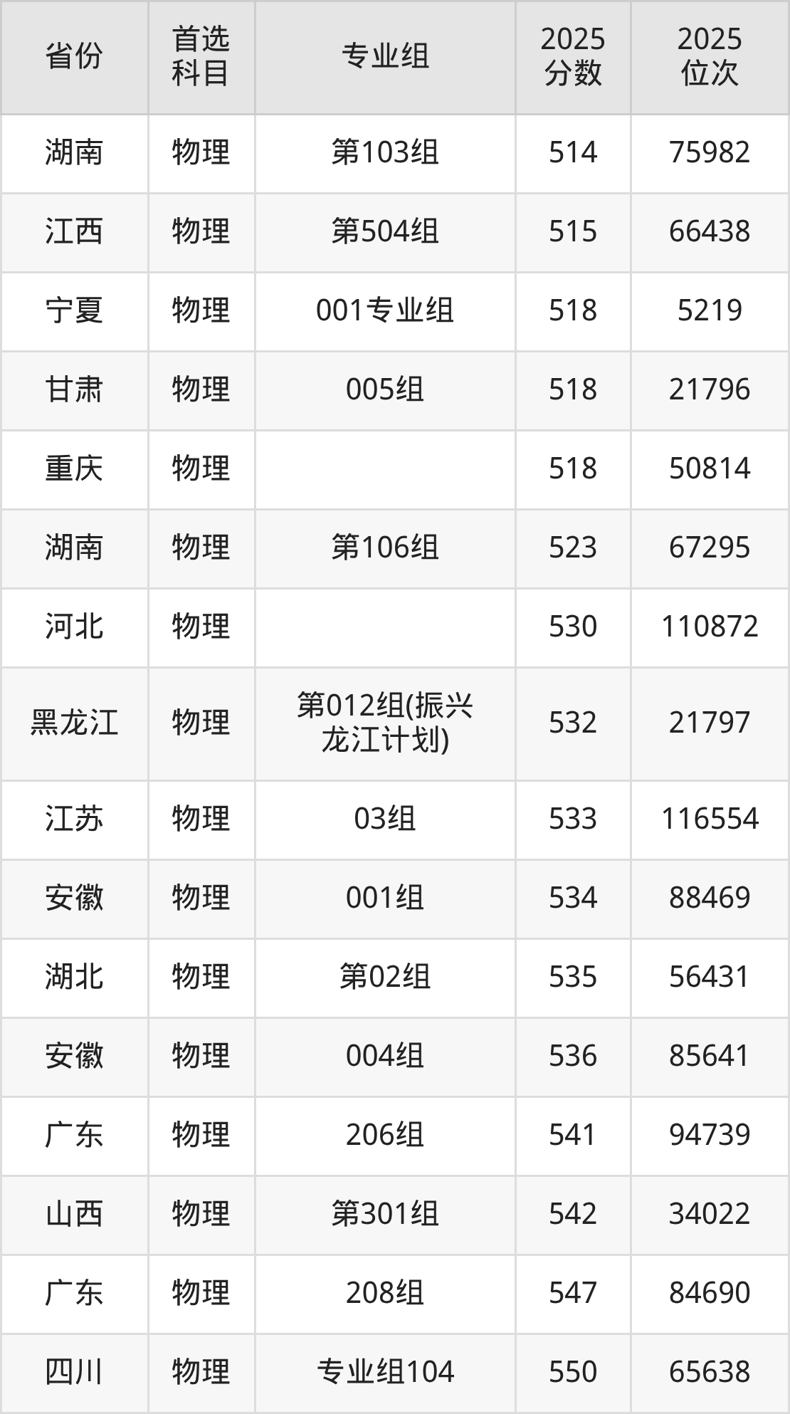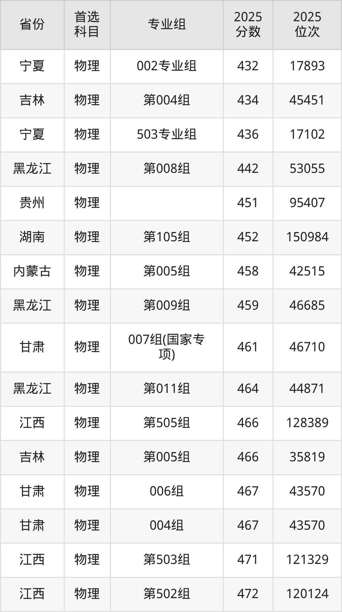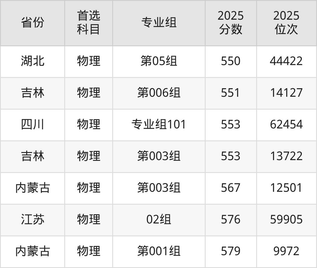物理类最低分对应地区为广西(105组),录取位次为128359,超本科线46分;最高分对应地区为内蒙古(第001组),录取位次为9972,超本科线204分。