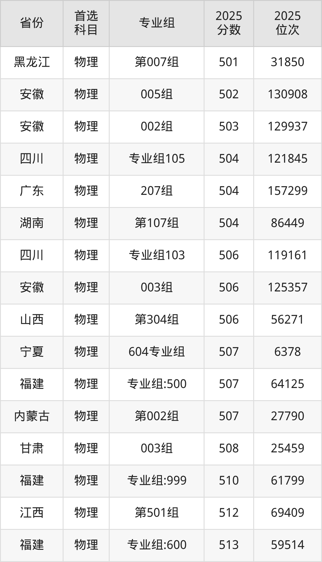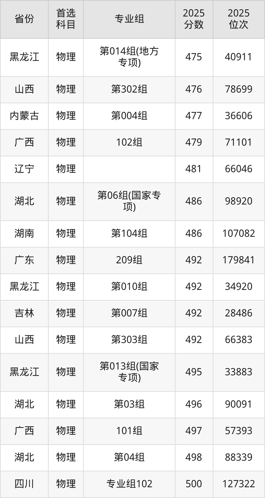 物理类:第007组501分、31850名,第008组442分、53055名,第009组459分、46685名,第010组492分、34920名,第011组464分、44871名,第012组(振兴龙江计划)532分、21797名,第013组(国家专项)495分、33883名,第014组(地方专项)475分、40911名;
