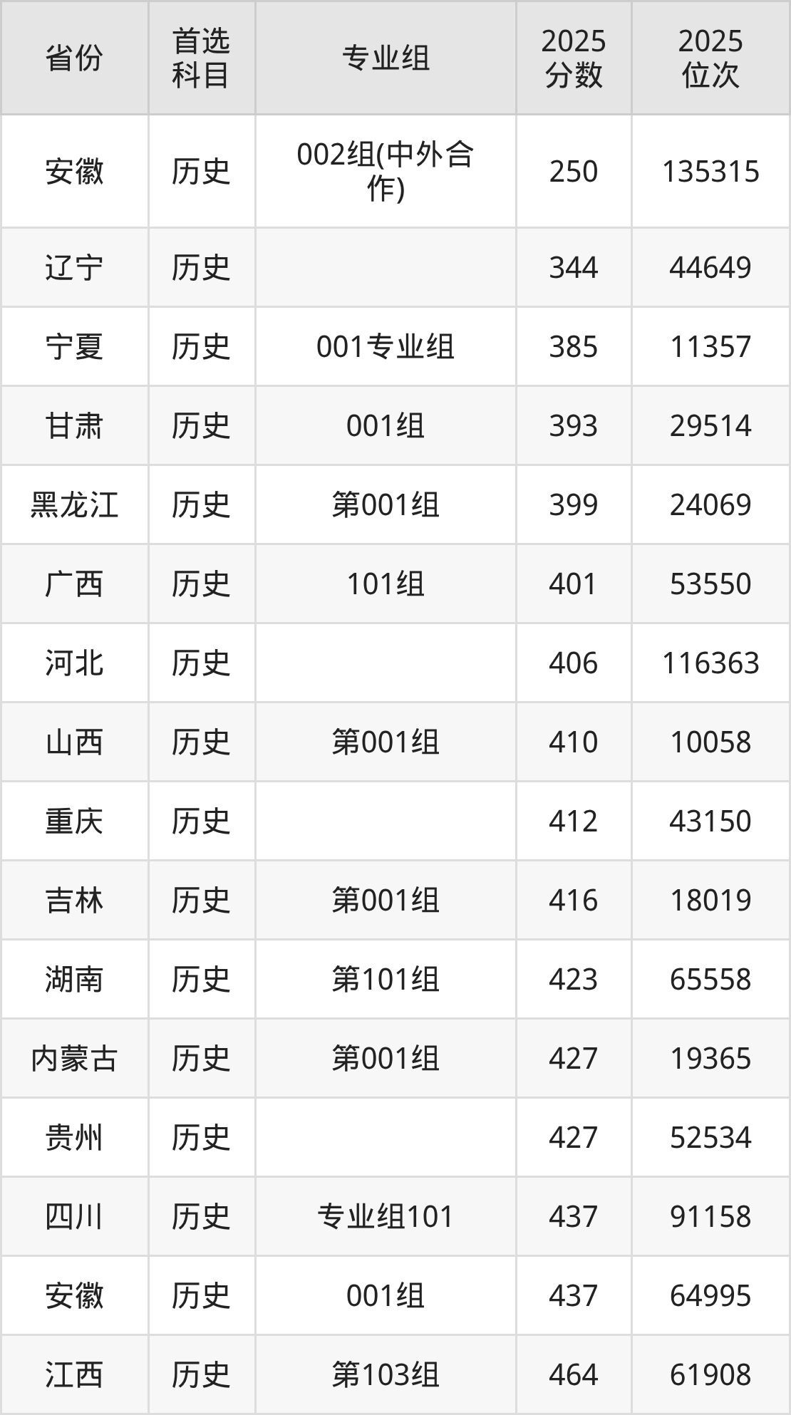 历史类最低分对应地区为安徽(002组(中外合作)),录取位次为135315;最高分对应地区为江西(第102组),录取位次为47049,超专科线196分。