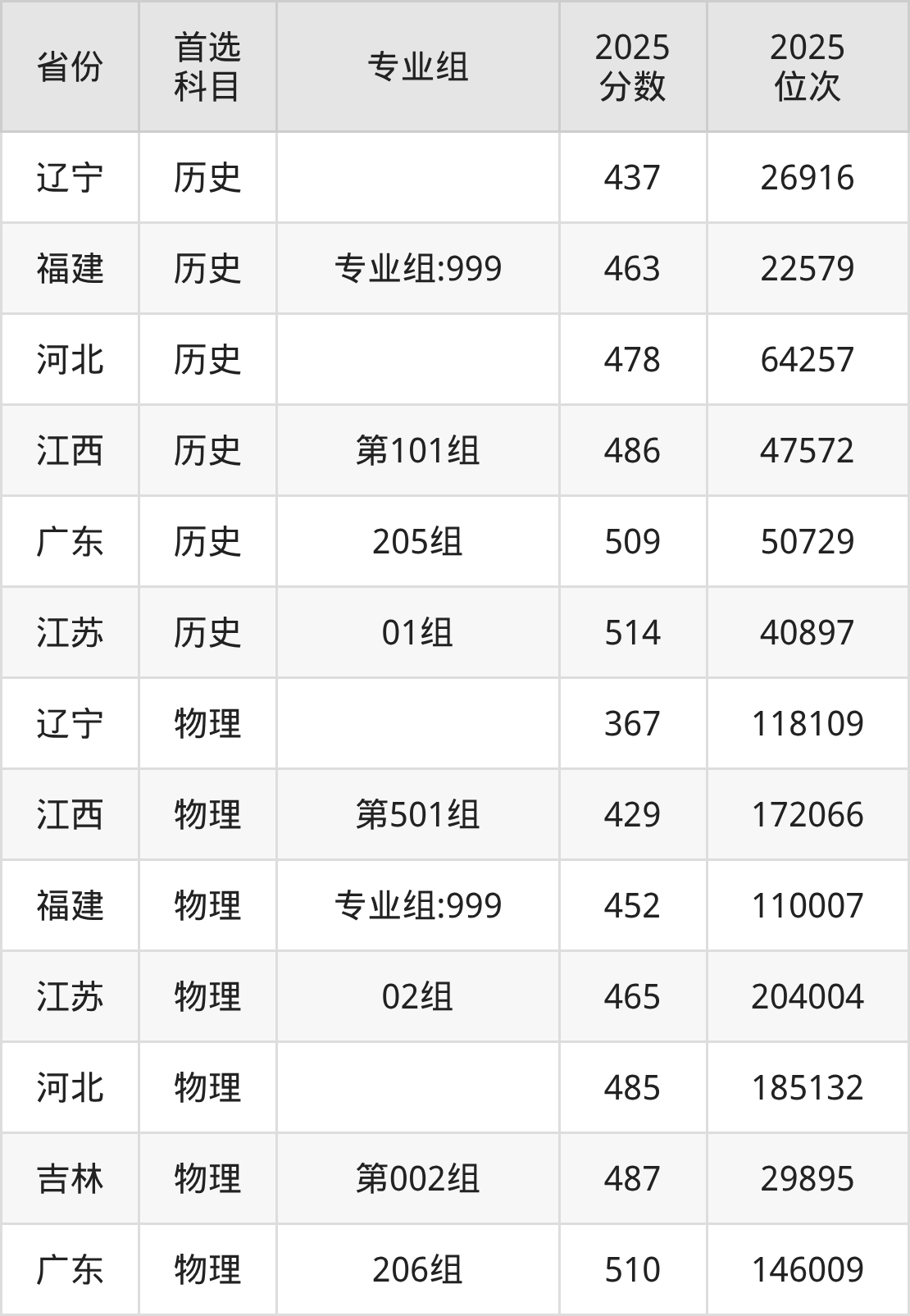 历史类最低分对应地区为辽宁,录取位次为26916;最高分对应地区为江苏(01组),录取位次为40897,超本科线32分。
