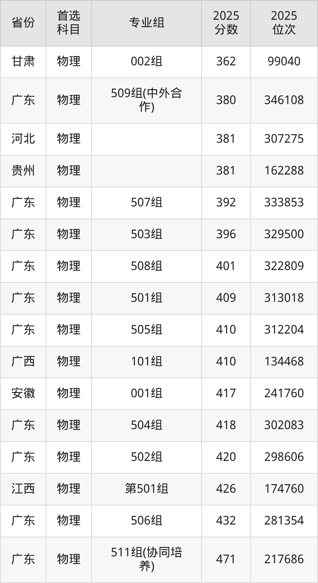 物理类:501组409分、313018名,502组420分、298606名,503组396分、329500名,504组418分、302083名,505组410分、312204名,506组432分、281354名,507组392分、333853名,508组401分、322809名,509组(中外合作)380分、346108名,510组(协同培养)478分、203826名,511组(协同培养)471分、217686名;