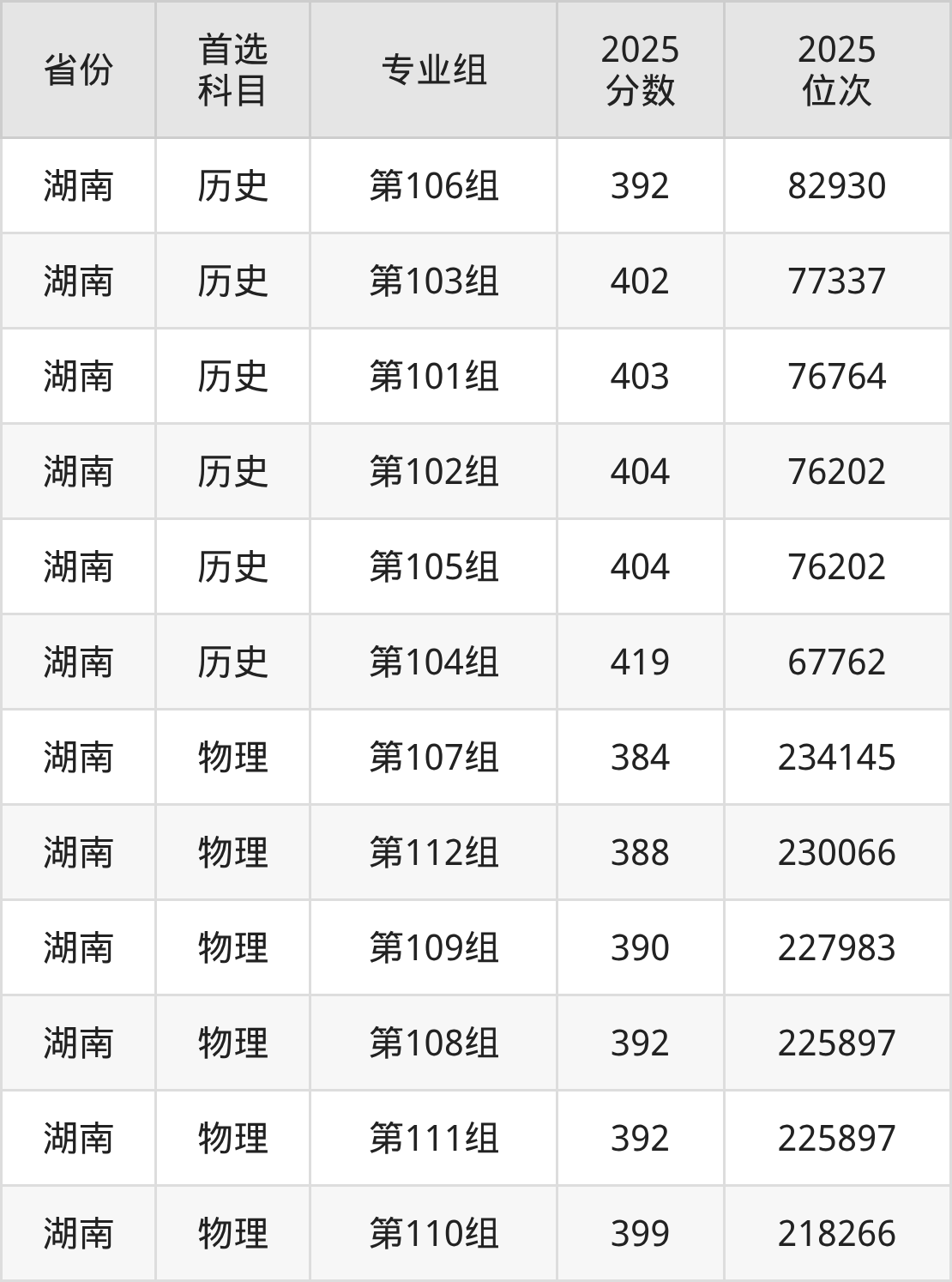 物理类最低分对应地区为湖南(第107组),录取位次为234145,超专科线184分;最高分对应地区为湖南(第110组),录取位次为218266,超专科线199分。