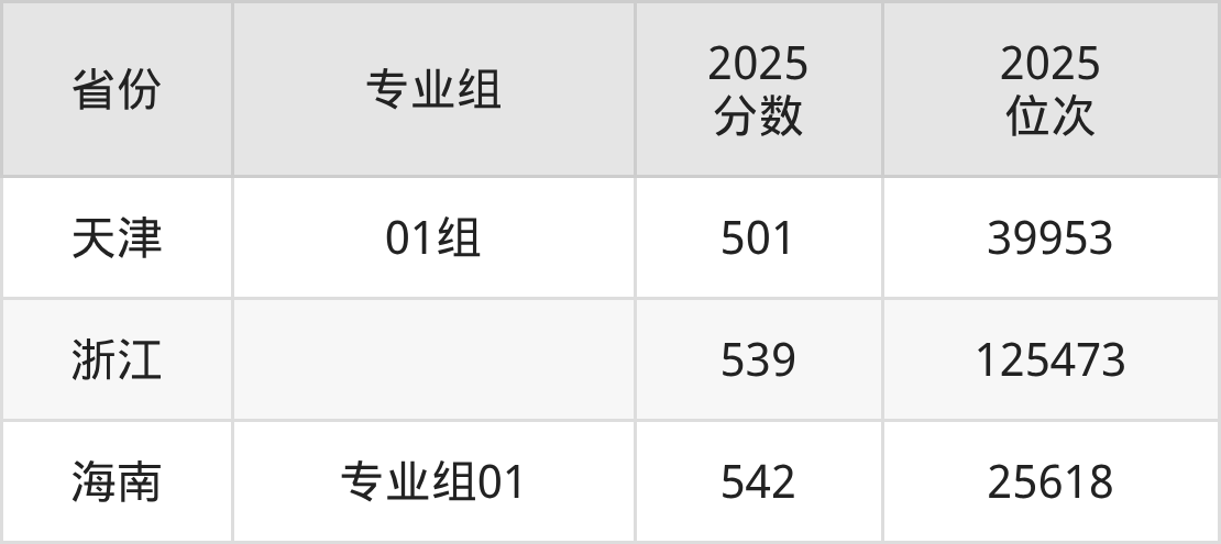 最低分对应地区为天津(01组),录取位次为39953,超本科线25分;最高分对应地区为海南(专业组01),录取位次为25618,超本科线62分。
