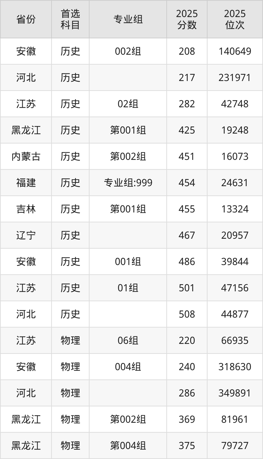 历史类最低分对应地区为安徽(002组),录取位次为140649,超专科线8分;最高分对应地区为河北,录取位次为44877,超本科线31分。