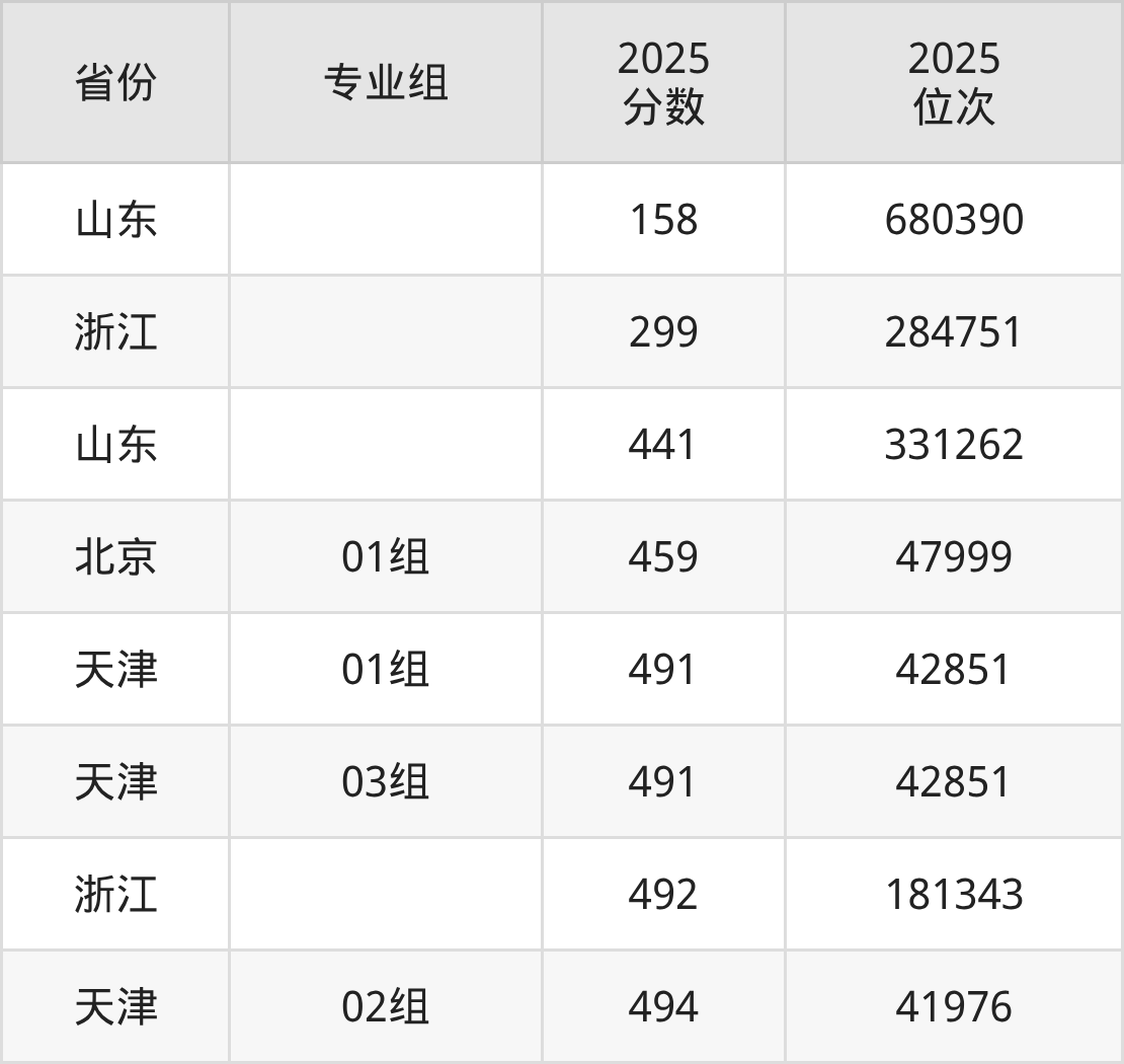 最低分对应地区为山东,录取位次为680390,超二段线8分;最高分对应地区为天津(02组),录取位次为41976,超本科线18分。