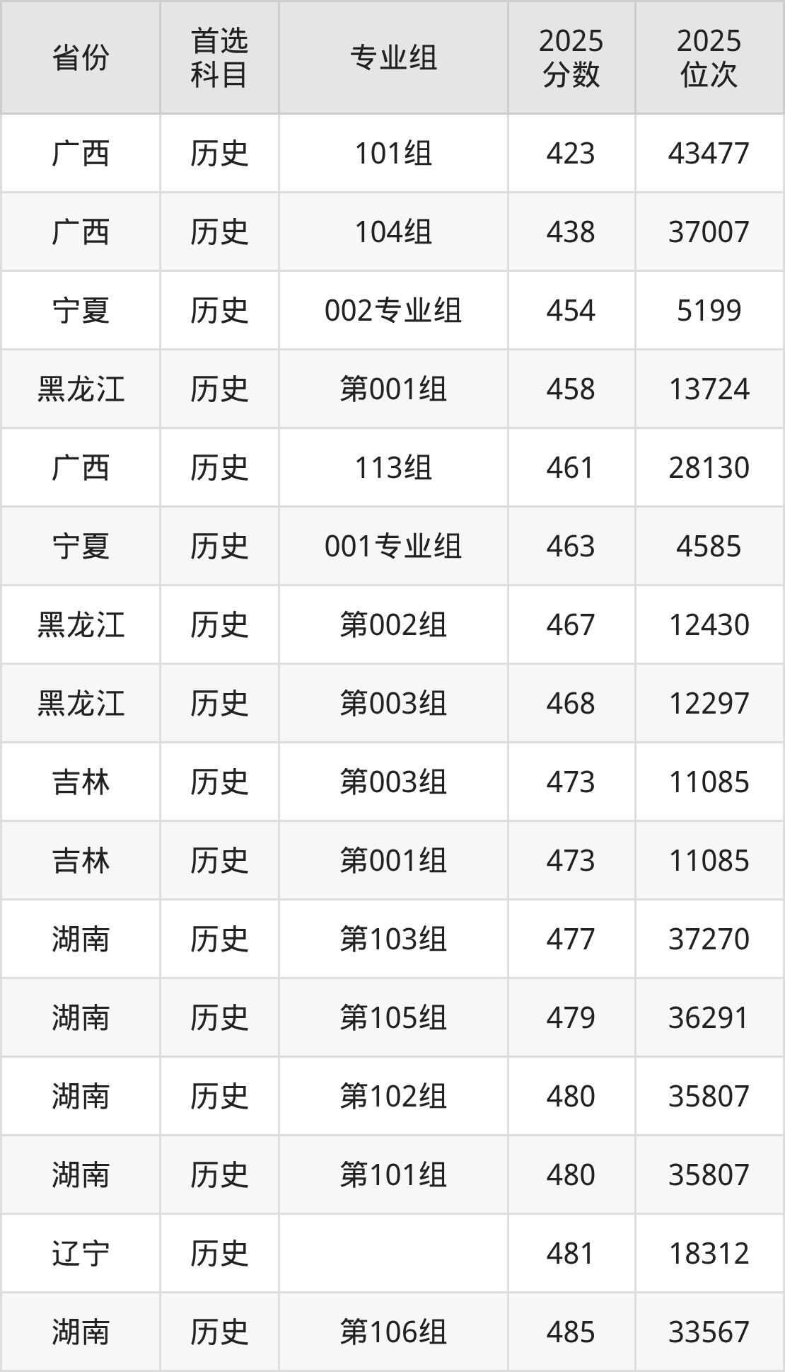 历史类最低分对应地区为广西(101组),录取位次为43477,超本科线21分;最高分对应地区为山西(第002组),录取位次为11024,超本科线94分。