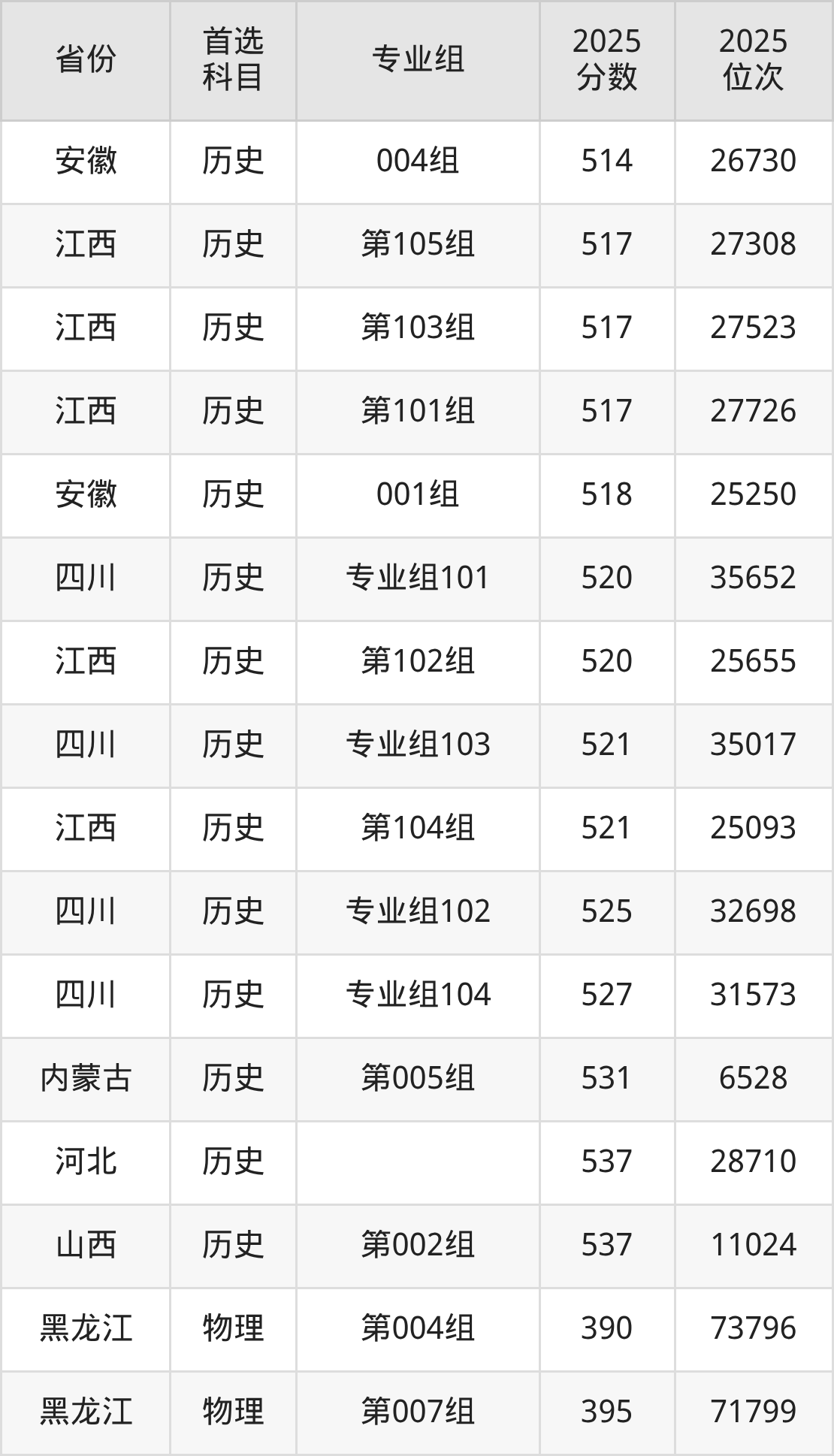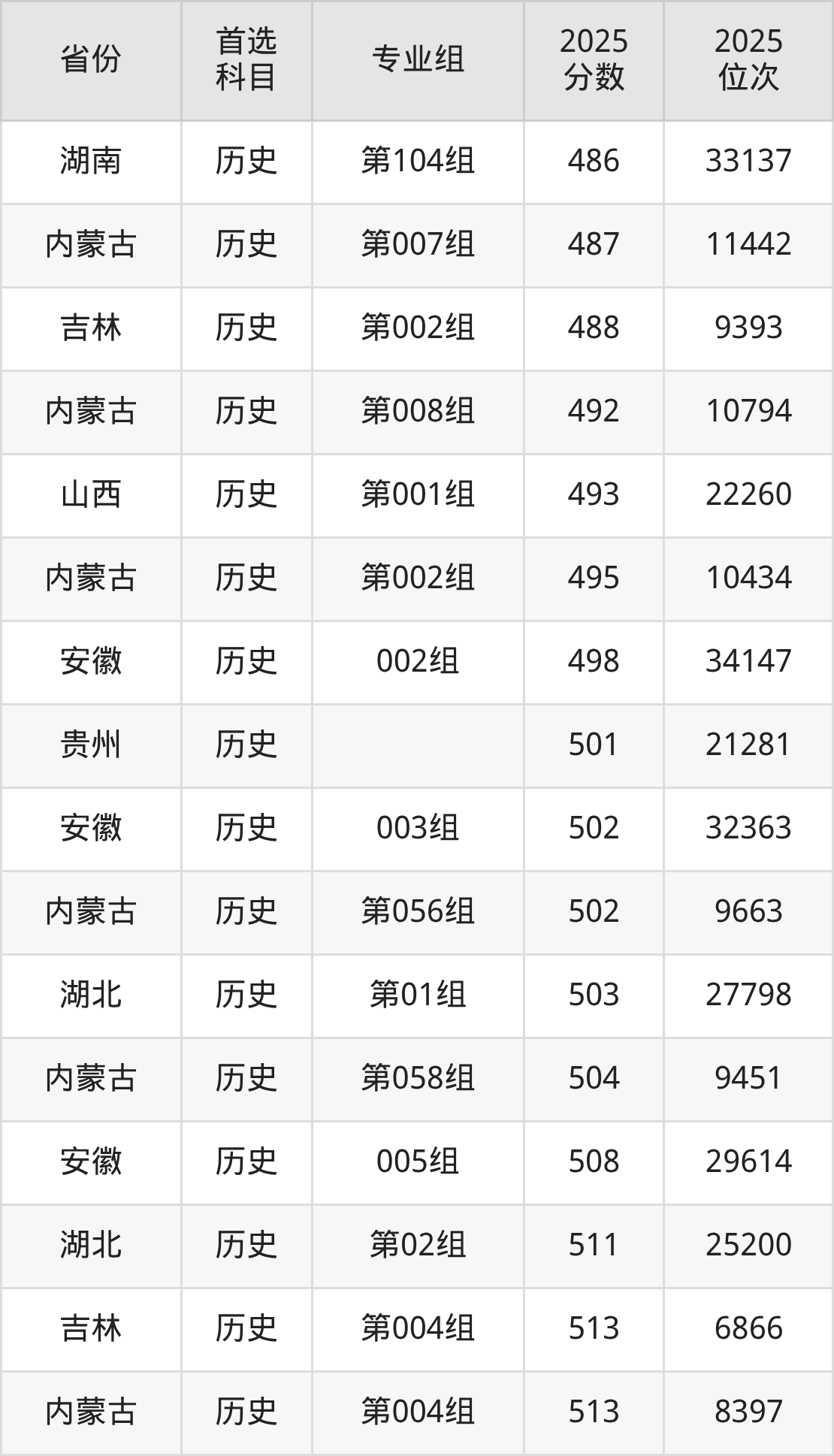 历史类:第002组495分、10434名,第004组513分、8397名,第005组531分、6528名,第007组487分、11442名,第008组492分、10794名,第056组502分、9663名,第058组504分、9451名;