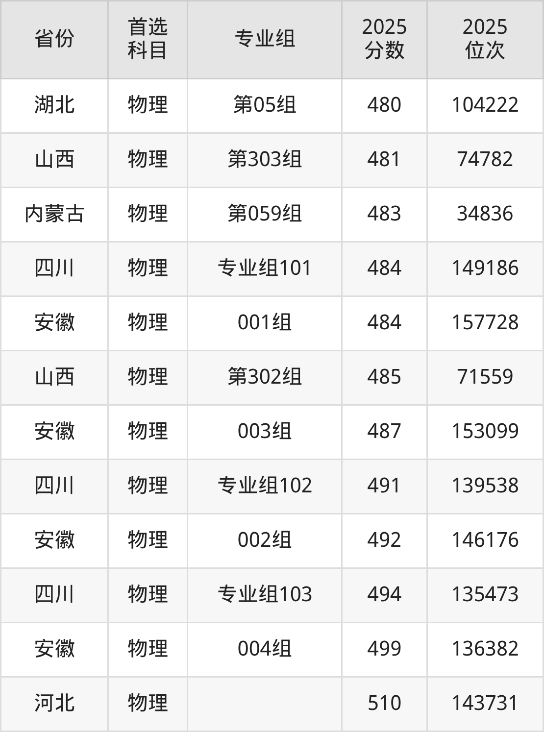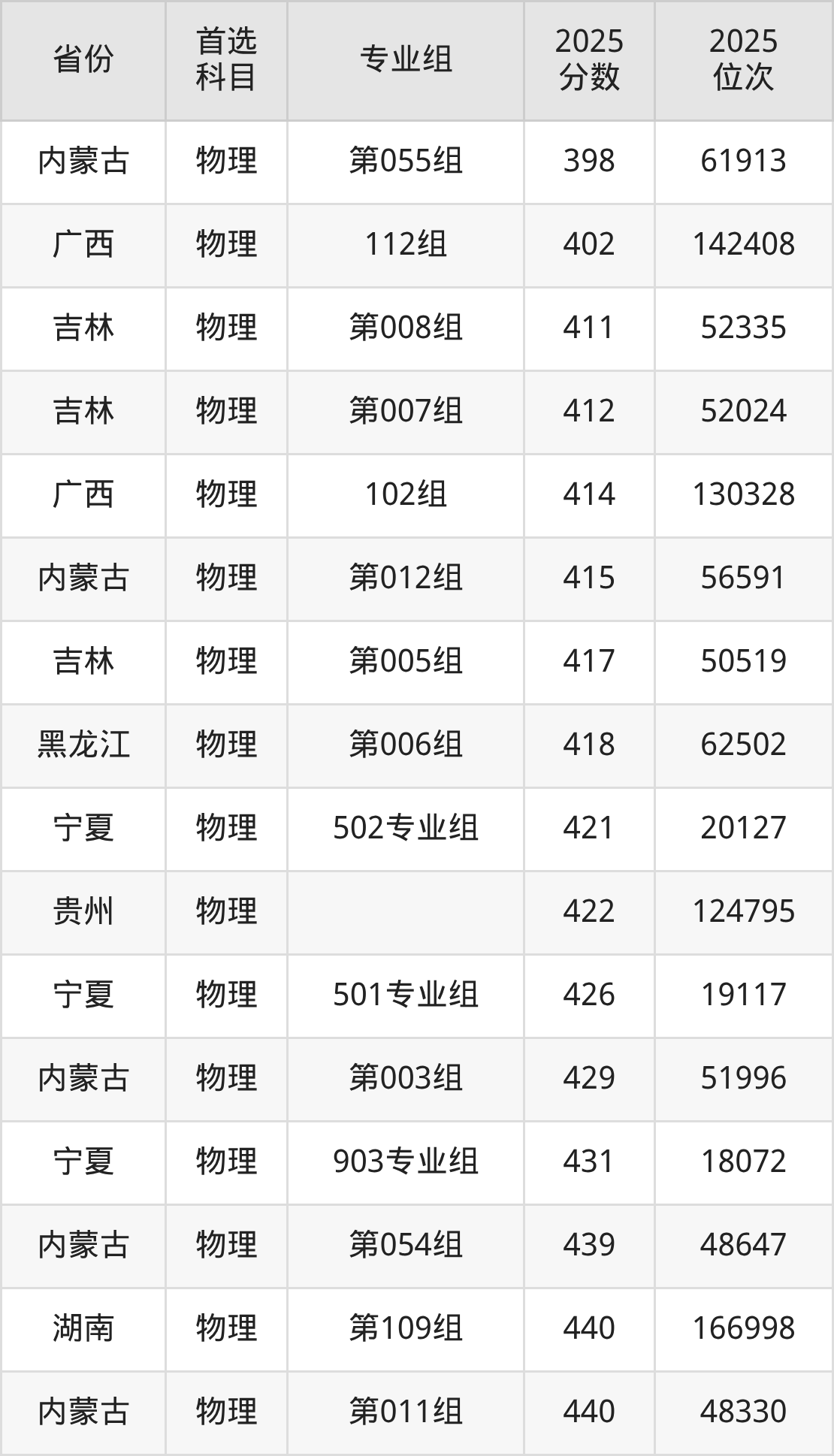 物理类:第003组429分、51996名,第009组454分、43816名,第011组440分、48330名,第012组415分、56591名,第054组439分、48647名,第055组398分、61913名,第057组470分、38737名,第059组483分、34836名;