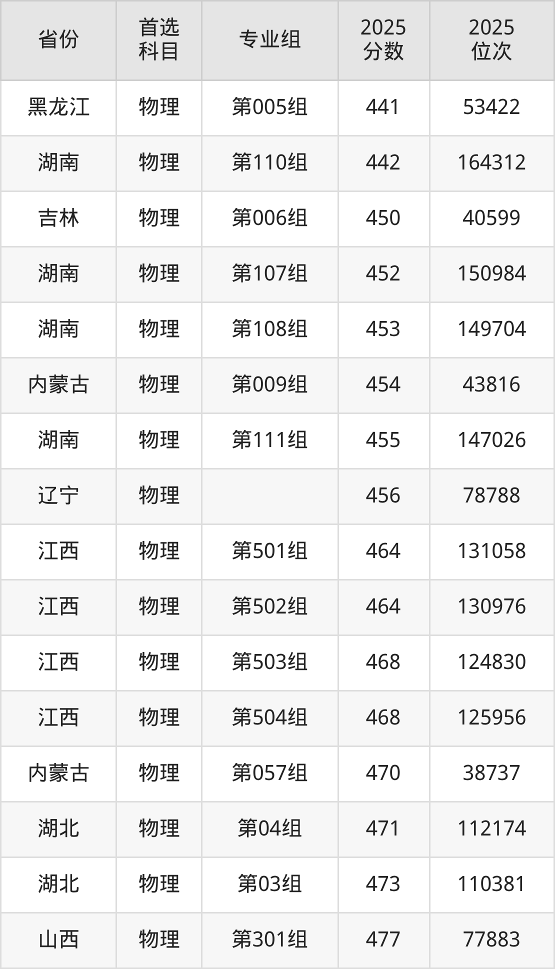 物理类最低分对应地区为黑龙江(第004组),录取位次为73796;最高分对应地区为河北,录取位次为143731,超本科线51分。