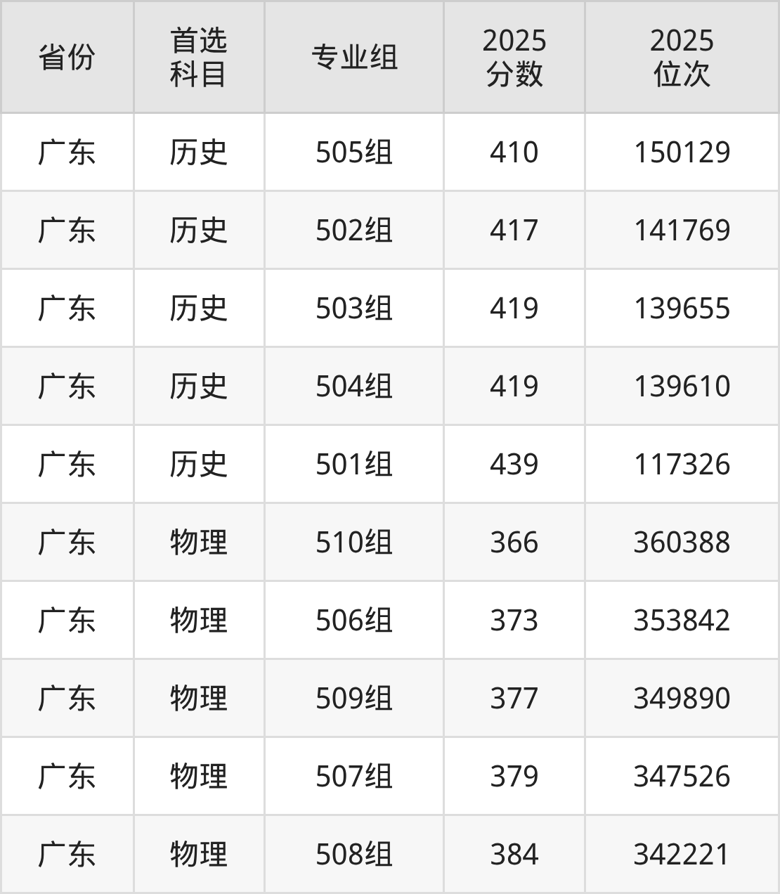 历史类最低分对应地区为广东(505组),录取位次为150129,超专科线195分;最高分对应地区为广东(501组),录取位次为117326,超专科线224分。