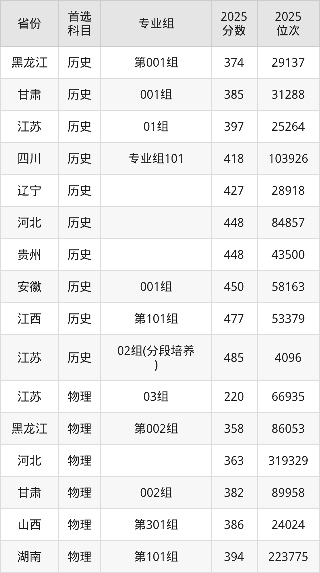历史类最低分对应地区为黑龙江(第001组),录取位次为29137,超专科线214分;最高分对应地区为江苏(02组(分段培养)),录取位次为4096,超专科线265分。