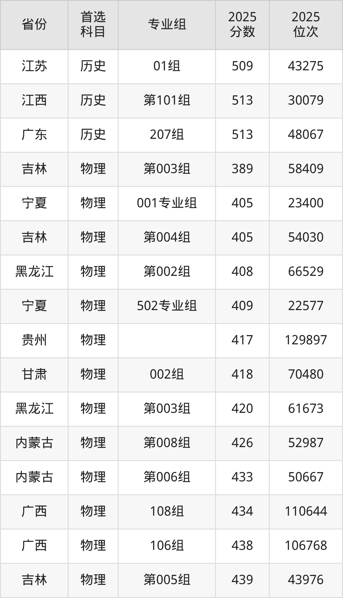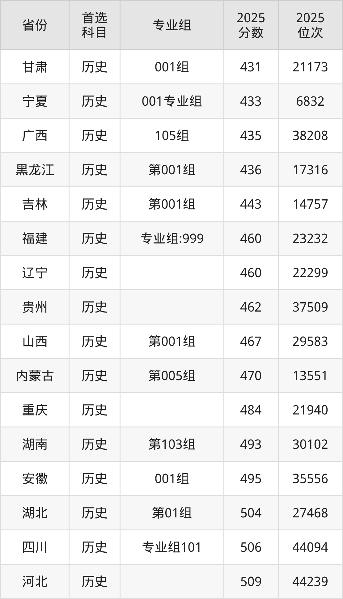 历史类最低分对应地区为甘肃(001组),录取位次为21173,超本科线19分;最高分对应地区为广东(207组),录取位次为48067,超本科线49分。