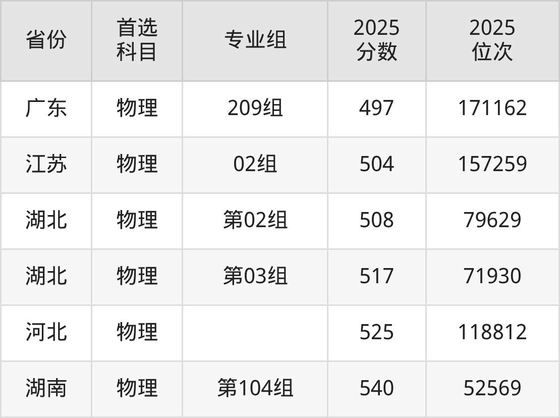 物理类最低分对应地区为吉林(第003组),录取位次为58409,超本科线49分;最高分对应地区为湖南(第104组),录取位次为52569,超本科线135分。