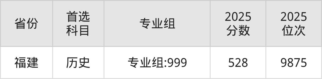 历史类最低分对应地区为福建(专业组:999),录取位次为9875,超本科线78分。
