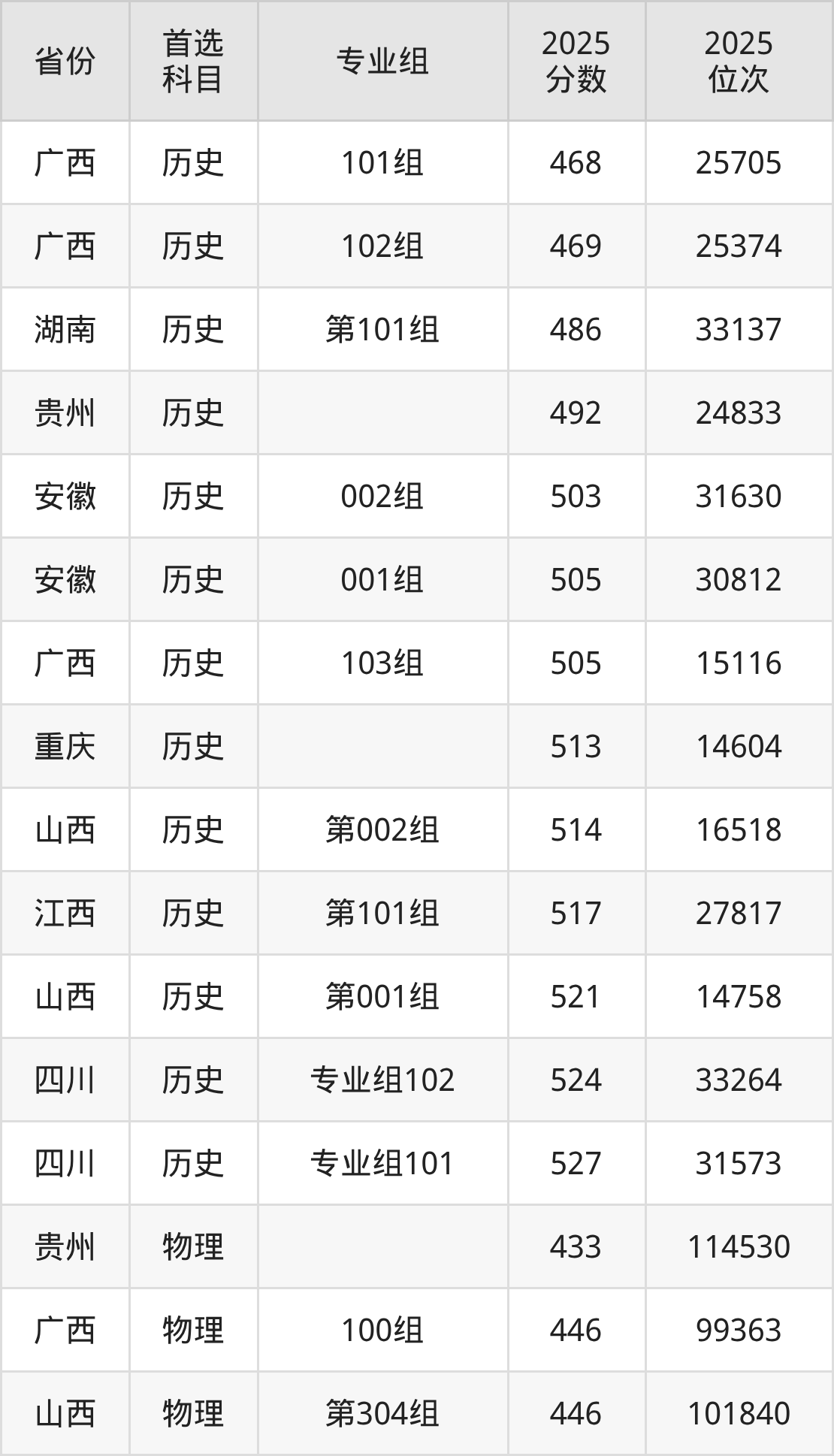 历史类最低分对应地区为广西(101组),录取位次为25705,超本科线66分;最高分对应地区为四川(专业组101),录取位次为31573。