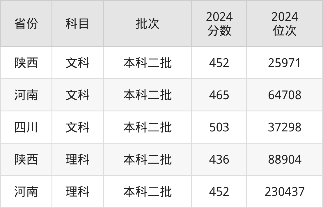 文科最低分对应地区为陕西,录取位次为25971,超二本线55分;最高分对应地区为四川,录取位次为37298,超二本线46分。