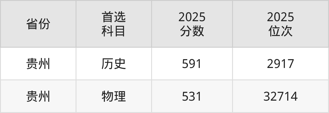 历史类最低分对应地区为贵州,录取位次为2917,超本科线133分。