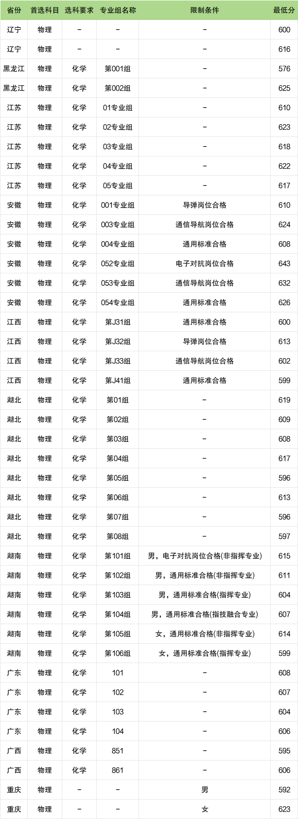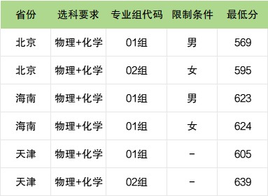 再比如在北京市,战略支援部队航天工程大学录取最低分是569分,但这只是在选考物理和化学科目的男生中的最低分,如果是选考物理和化学科目的女生,最低分则高达595分。